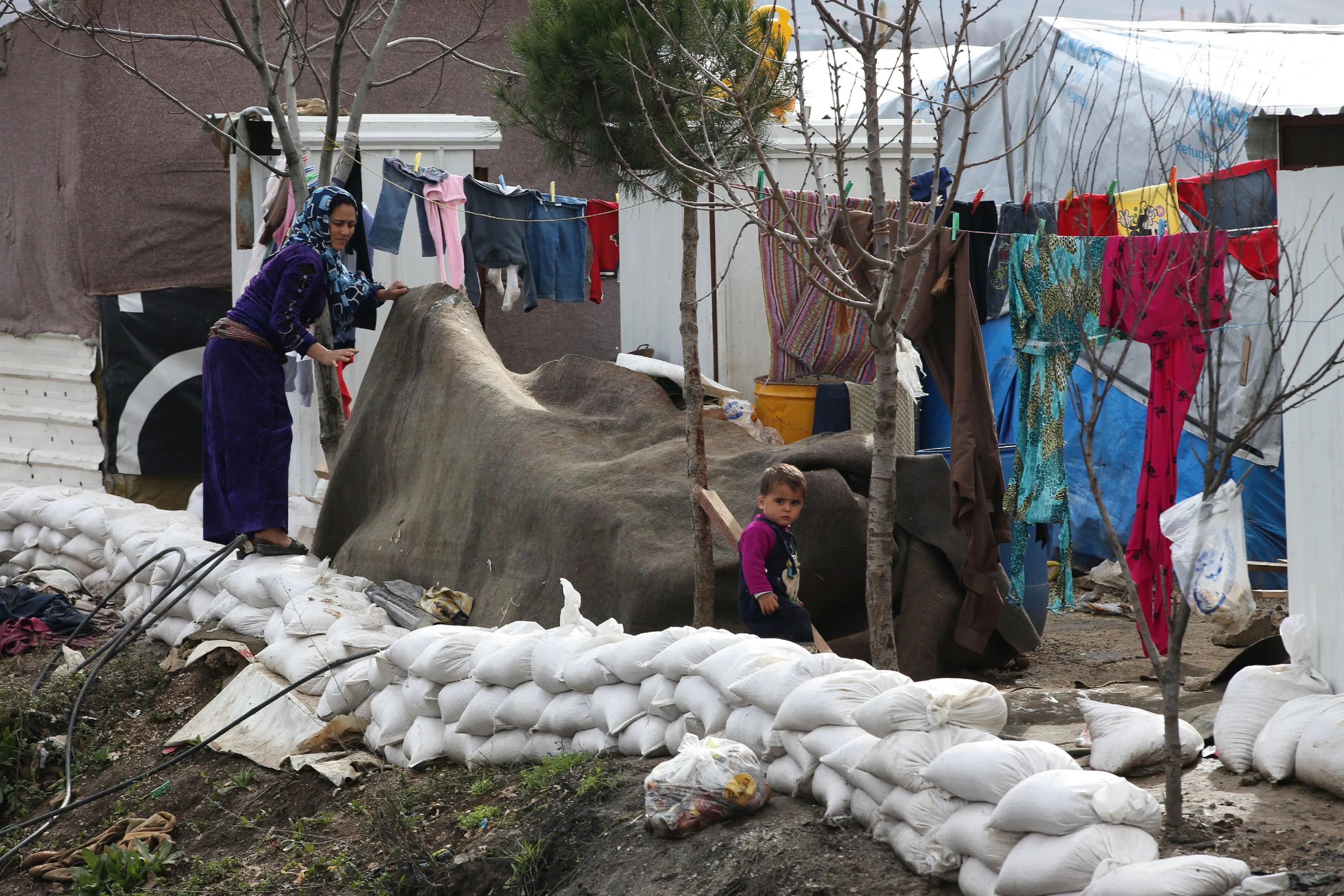 A Syrian woman, left, covers some of her belongings, as sand bags are seen set around her tent to protect it from flooding, in preparation for the possibility of a snow storm at a refugee camp in Deir Zannoun village, Bekaa valley, Lebanon, Tuesday, January 6, 2015. (Photo by Hussein Malla/AP Photo)