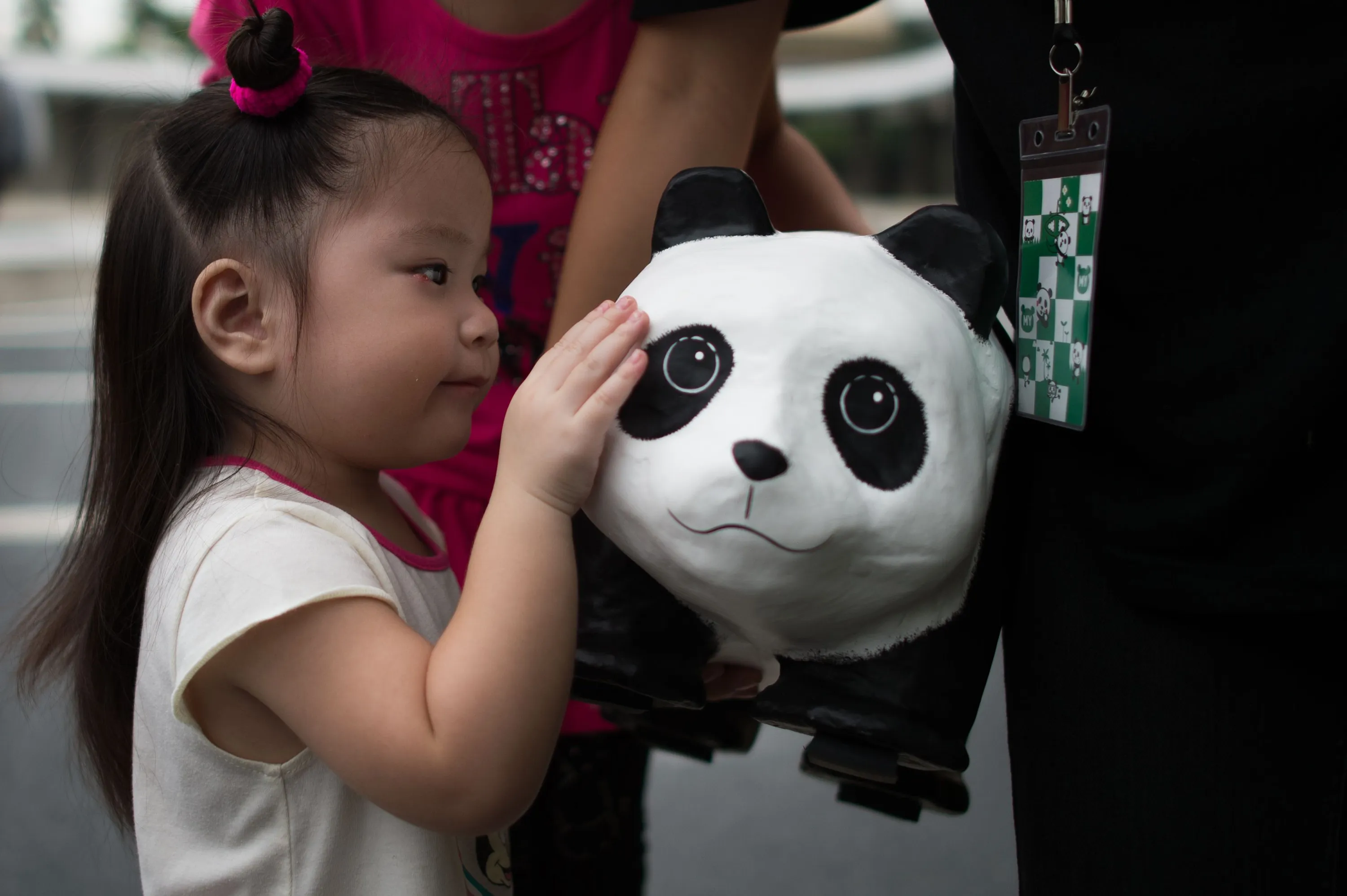 A girl touches a papier-mache pandas before it is displayed at the National Monument in Kuala Lumpur on January 9, 2015. The event, consisting of placing 1,600 papier-mache pandas in various cities around the world, was created by French artist Paulo Grangeon in collaboration with the WWF and is aimed at raising awareness of the endangered species. (Photo by Mohd Rasfan/AFP Photo)