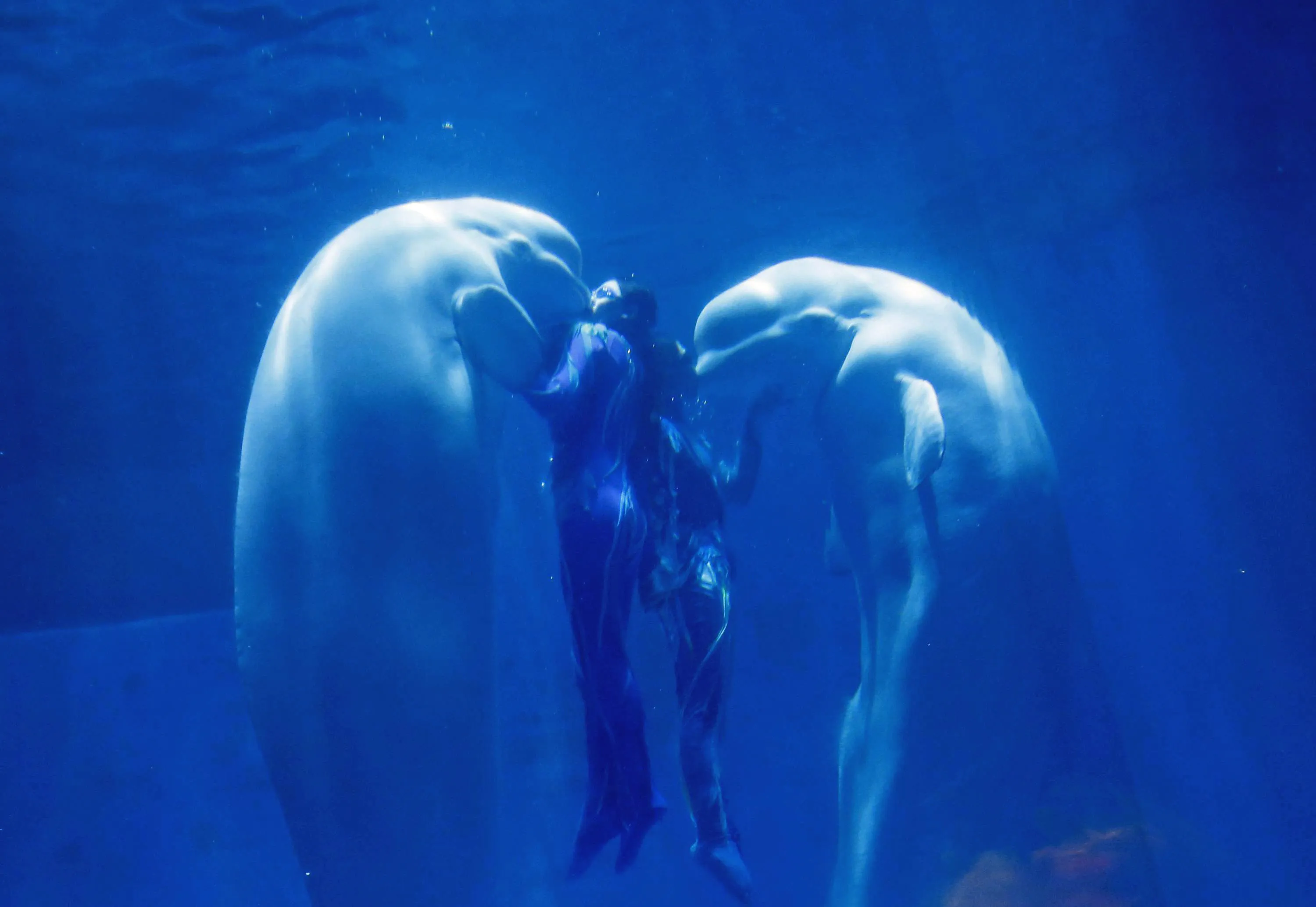 Beluga whales and their trainers present “The heart of Ocean” show at the Harbin Polarland in the northern city of Harbin, Heilongjiang province January 6, 2015. The polar land themed park combining animal shows and polar land sights has had increased visitors during the annual Harbin International Ice and Snow Festival, the park said. (Photo by Kim Kyung-Hoon/Reuters)
