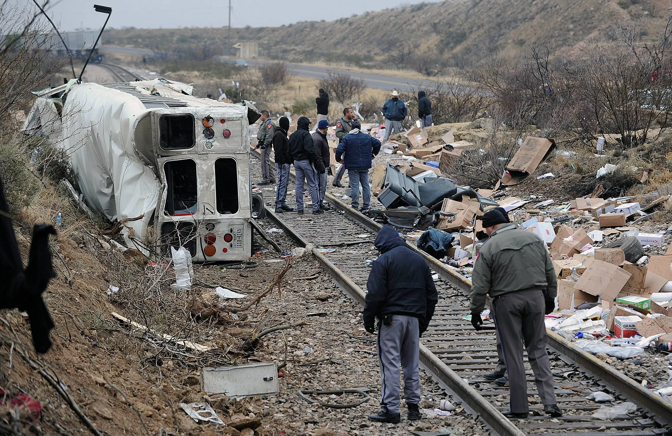 Authorities investigate the scene of a prison bus crash, Wednesday, January 14, 2015, in Penwell, Texas. (Photo by Mark Sterkel/AP Photo/Odessa American)