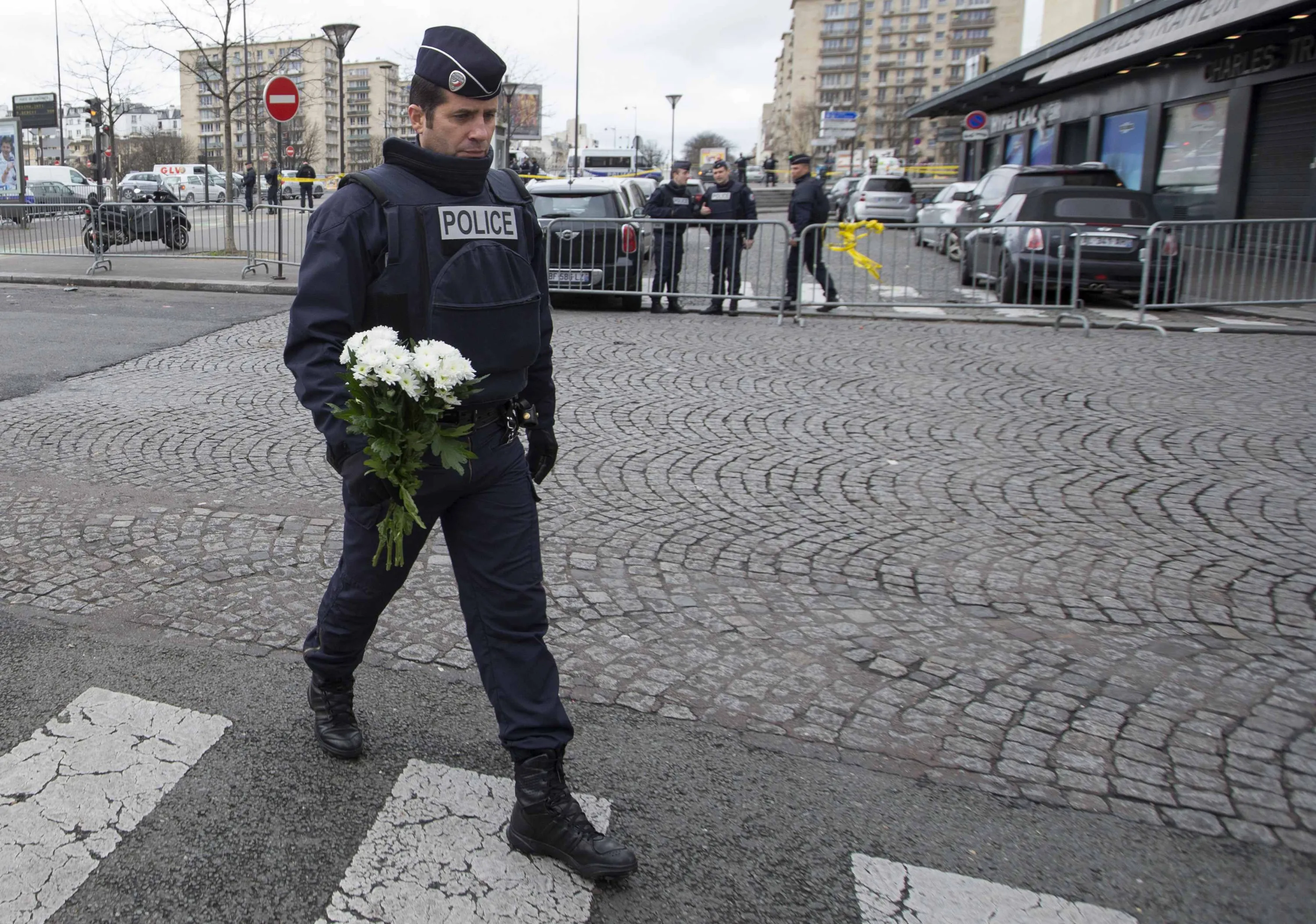 A French police officer prepares to place flowers outside the Hyper Cacher kosher supermarket near Porte de Vincennes in eastern Paris, January 10, 2015. French President Francois Hollande confirmed reports on Friday that four hostages, along with the gunman Amedy Coulibay, were killed at a siege of the Hyper Cacher supermarket in eastern Paris. (Photo by Yves Herman/Reuters)