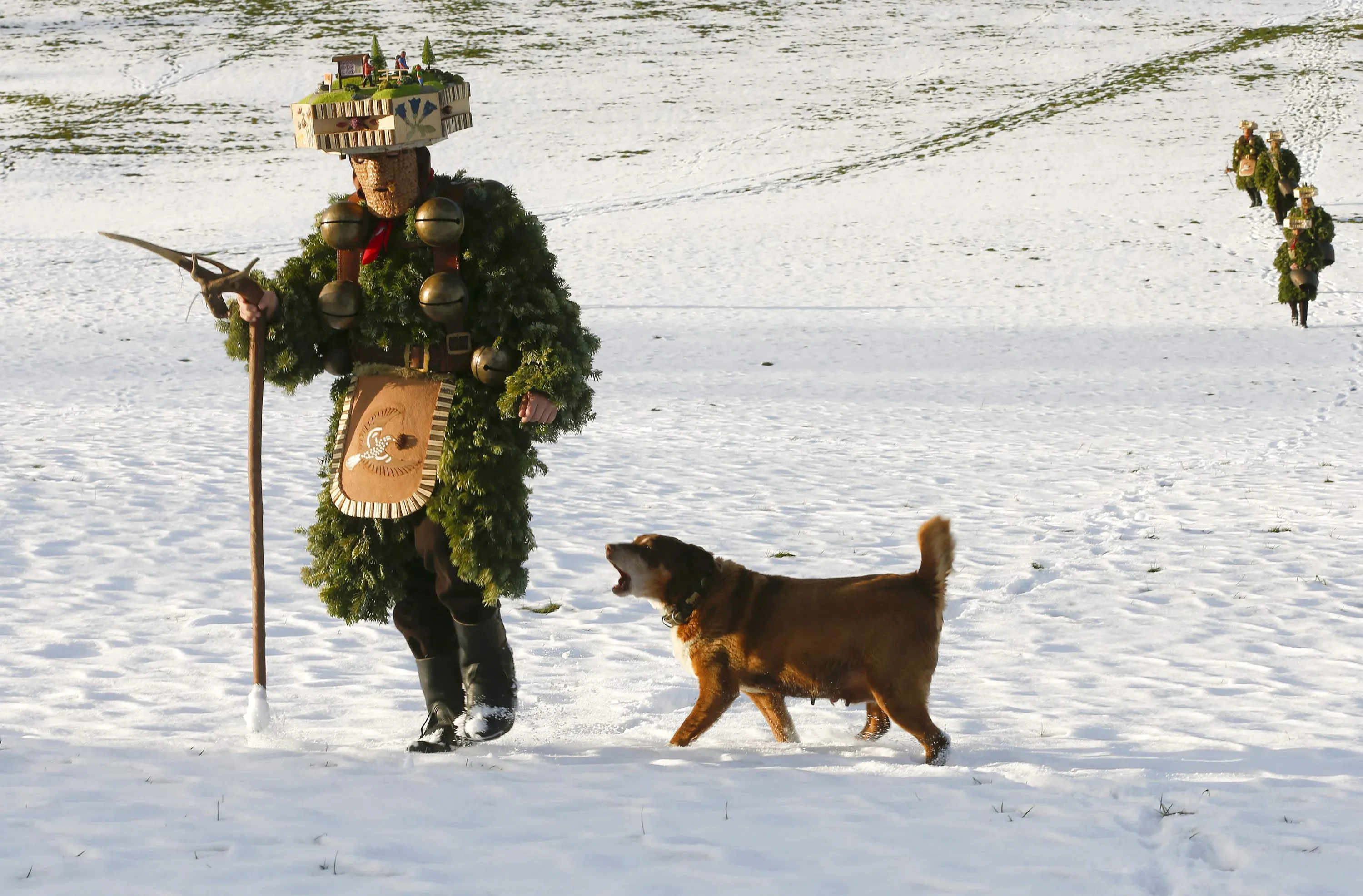 Men dressed as “Chlaeuse”, figures that scare away evil spirits, carry bells as they walk over a partially snow-covered meadow near the northeastern village of Urnaesch, Switzerland January 13, 2015. (Photo by Arnd Wiegmann/Reuters)