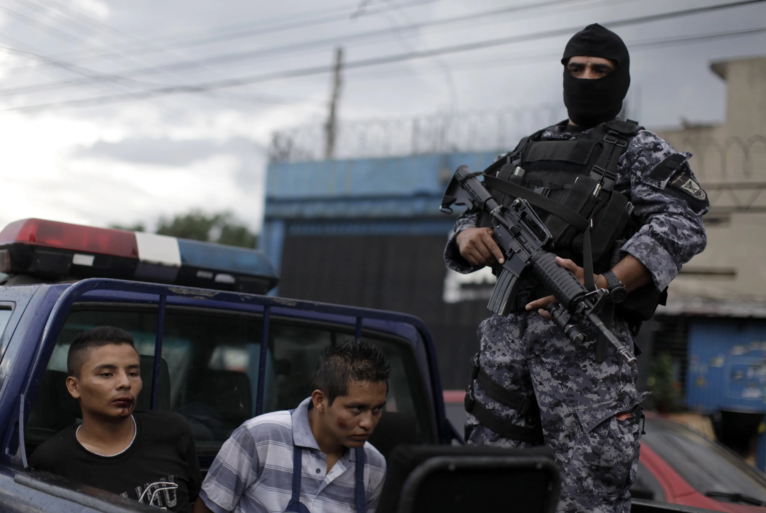 A police officer stands guard next to alleged gang members who are accused of killing a private security agent at the central market in San Salvador October 8, 2014. (Photo by Jose Cabezas/Reuters)