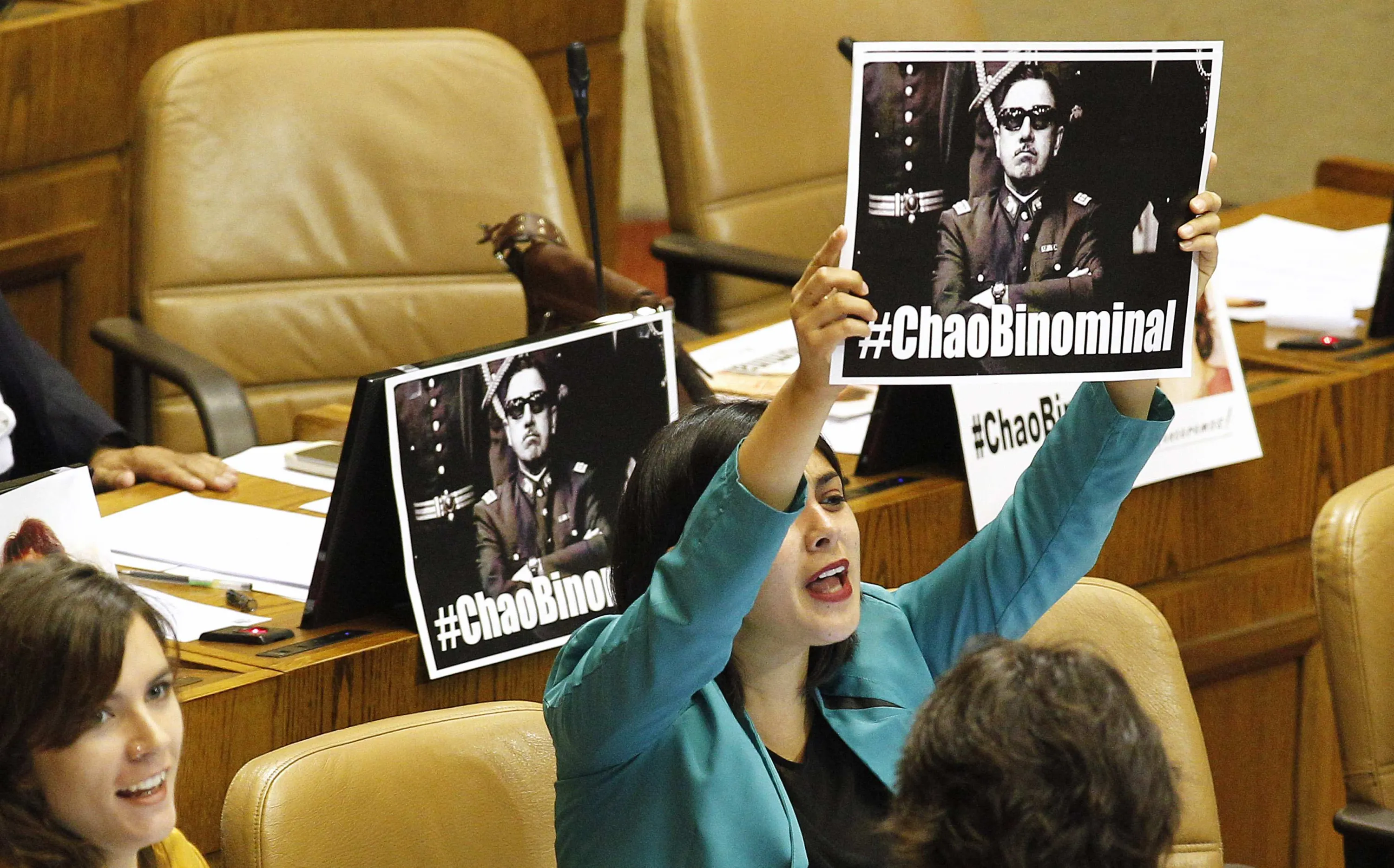 Communist Party deputy Karol Cariola, holds up a banner with the image of former dictator Augusto Pinochet, inside the congress, after a vote to reform the binomial voting system, in Valparaiso city, Northwest of Santigo January 20, 2015. The vote overturns a byzantine electoral system introduced by dictator Augusto Pinochet before he departed from power that has effectively excluded parties that do no belong to one of two leading coalitions and prevented either coalition from winning a significant majority in Congress. Pinochet, who ruled the South American country from 1973-1990, intended to ensure conservative parties retained a strong voice after the return to democracy. The new law also introduces quotas to increase the participation of women in Congress. Each party entering an election must ensure that no more than 60 percent of its candidates are just one gender. The banner reads: “Bye Binominal”. (Photo by Rodrigo Garrido/Reuters)