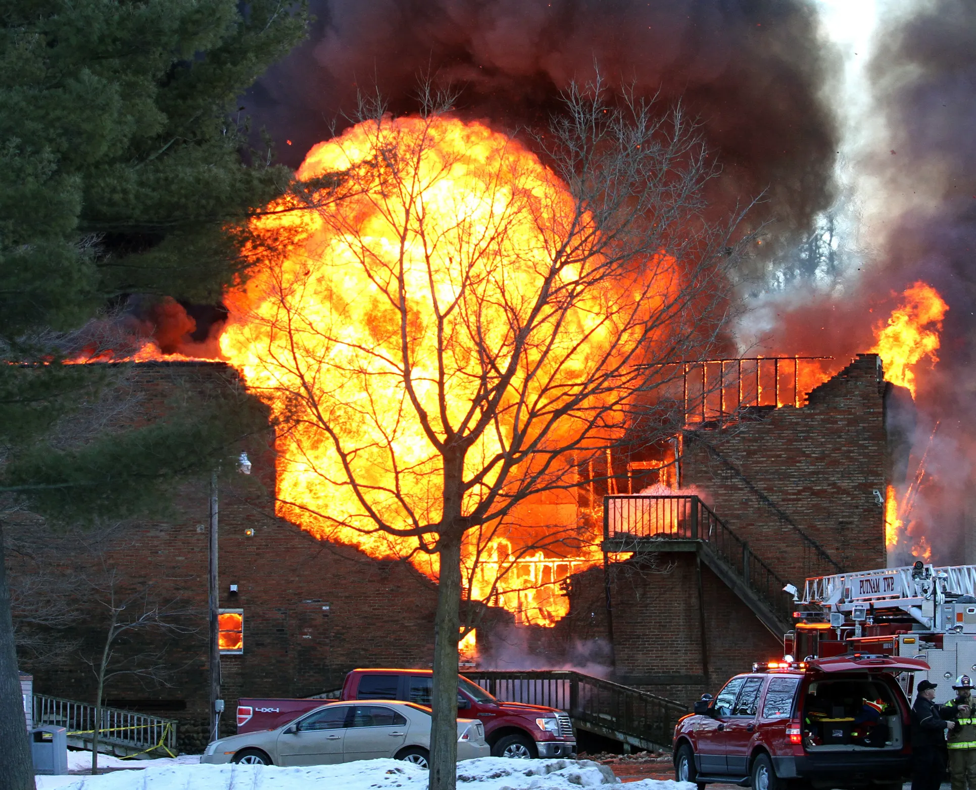 A fireball rolls upward after a section of a wall toppled into the interior of the Unadilla Store, Tuesday, January 27, 2015, in Undadilla Township, Mich. Authorities say one firefighter has been hospitalized. (Photo by Alan Ward/AP Photo/Livingston County Daily Press & Argus)