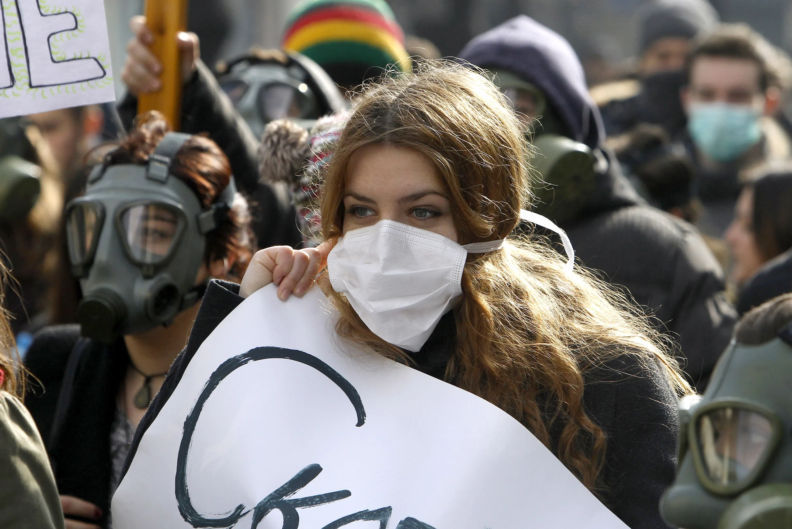 Environmentalists, wearing protective and gas masks, march through a street protesting against the polluted air in Skopje, Macedonia, Sunday, February 1, 2015. A few hundred of environmentalists protested Sunday to raise awareness about air pollution and nature contamination. (Photo by Boris Grdanoski/AP Photo)