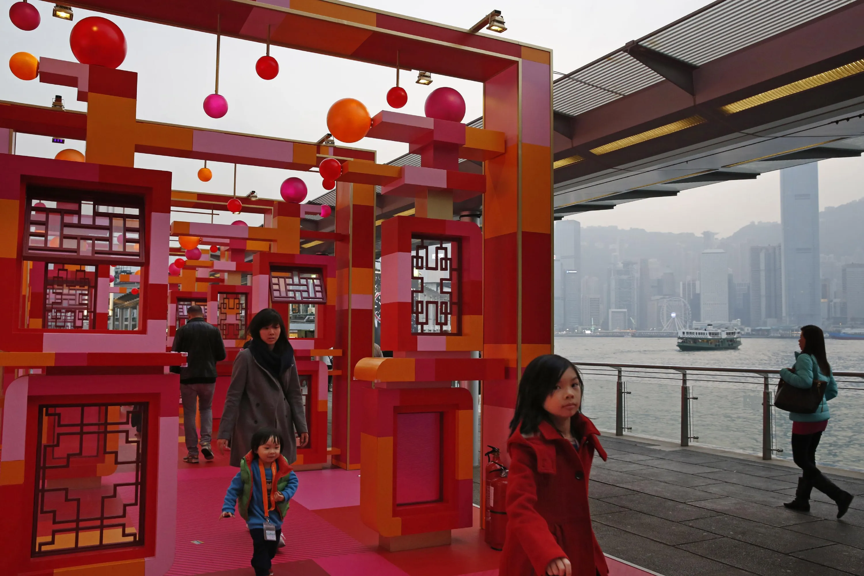 Pedestrians walk through decorations celebrating the upcoming Chinese Lunar New Year in Hong Kong, Wednesday, February 4, 2015. The Lunar New Year falls on Feb. 19 to mark the Year of the Goat in the Chinese calendar. (Photo by Kin Cheung/AP Photo)