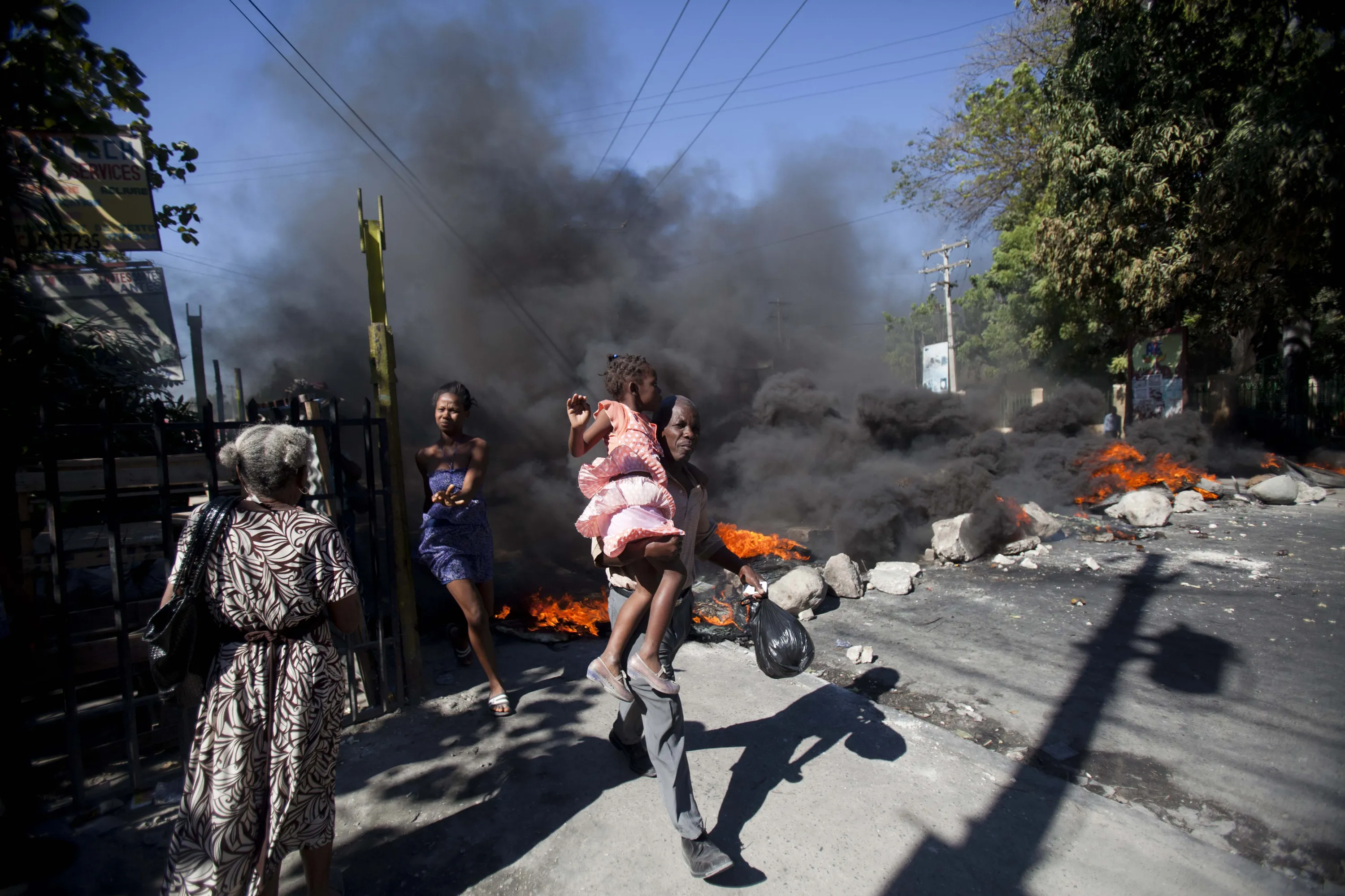 Residents run past a burning barricade set by public transportation drivers at the start a their two day strike over the cost of fuel in Port-au-Prince, Haiti, Monday, February 2, 2015. (Photo by Dieu Nalio Chery/AP Photo)