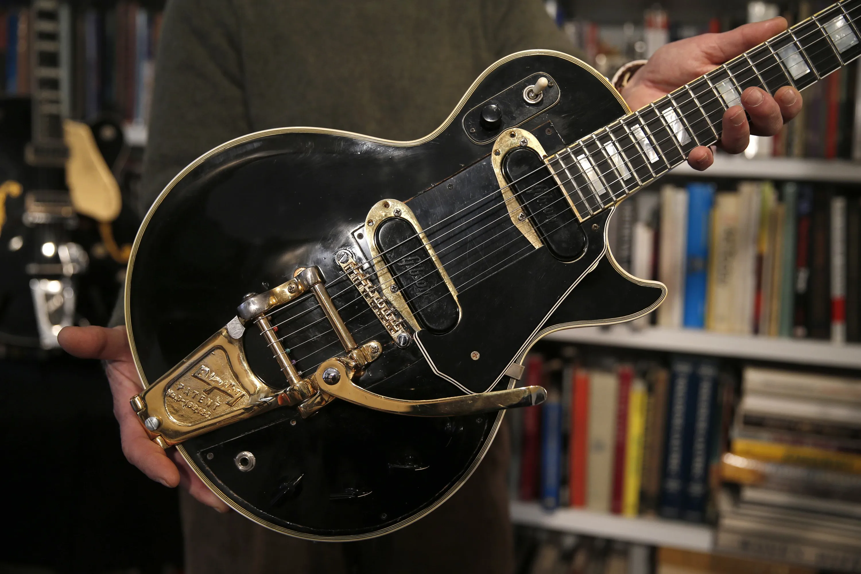 Guernsey's Auctions President Arlan Ettinger holds the Les Paul guitar known as “Black Beauty”, which will go up for auction next month, in New York January 29, 2015. The electric instrument, which is the original prototype for the Les Paul Custom guitars made the Gibson Guitar Company, will be sold by Guernsey's Auctions at the Arader Galleries on February 19. No pre-auction estimate, or reserve price, has been put on the instrument. But some music experts believe it could exceed the record auction price of $965,000 paid in 2013 for the guitar owned and played by Bob Dylan at his first electric performance at the Newport Folk Festival in 1965. (Photo by Mike Segar/Reuters)