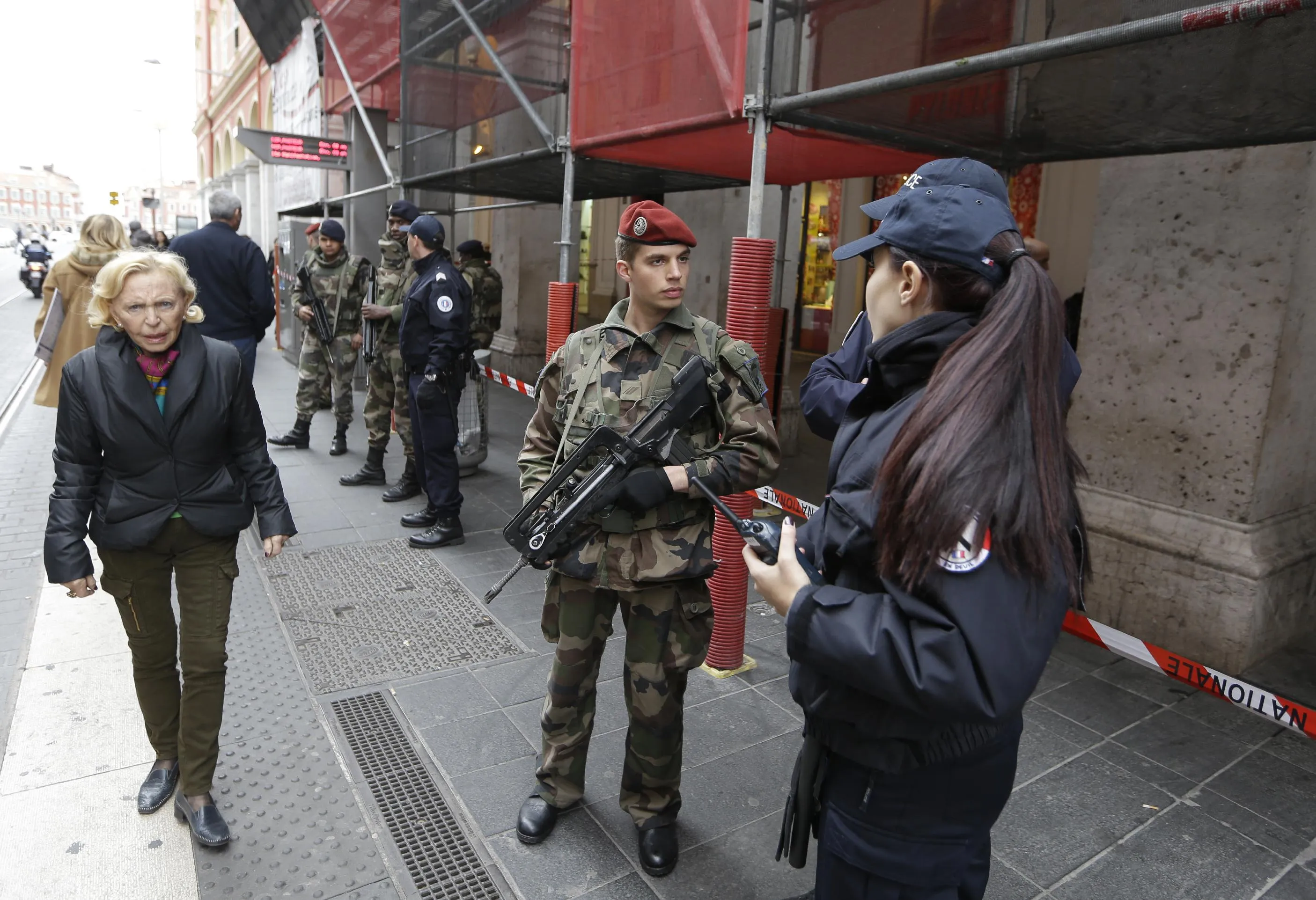 Soldiers and police officers stand guard after an attacker with a knife hidden in his bag attacked three soldiers on an anti-terror patrol in front of a Jewish community center in Nice, southern France, Tuesday February 3, 2015. France has been on high alert since the attacks in the Paris region by three Islamic extremists that left 20 people dead, including the gunmen. More than 10,000 soldiers have been deployed around the country to protect sensitive locations, including major shopping areas, synagogues, mosques and transit hubs. (Photo by Lionel Cironneau/AP Photo)