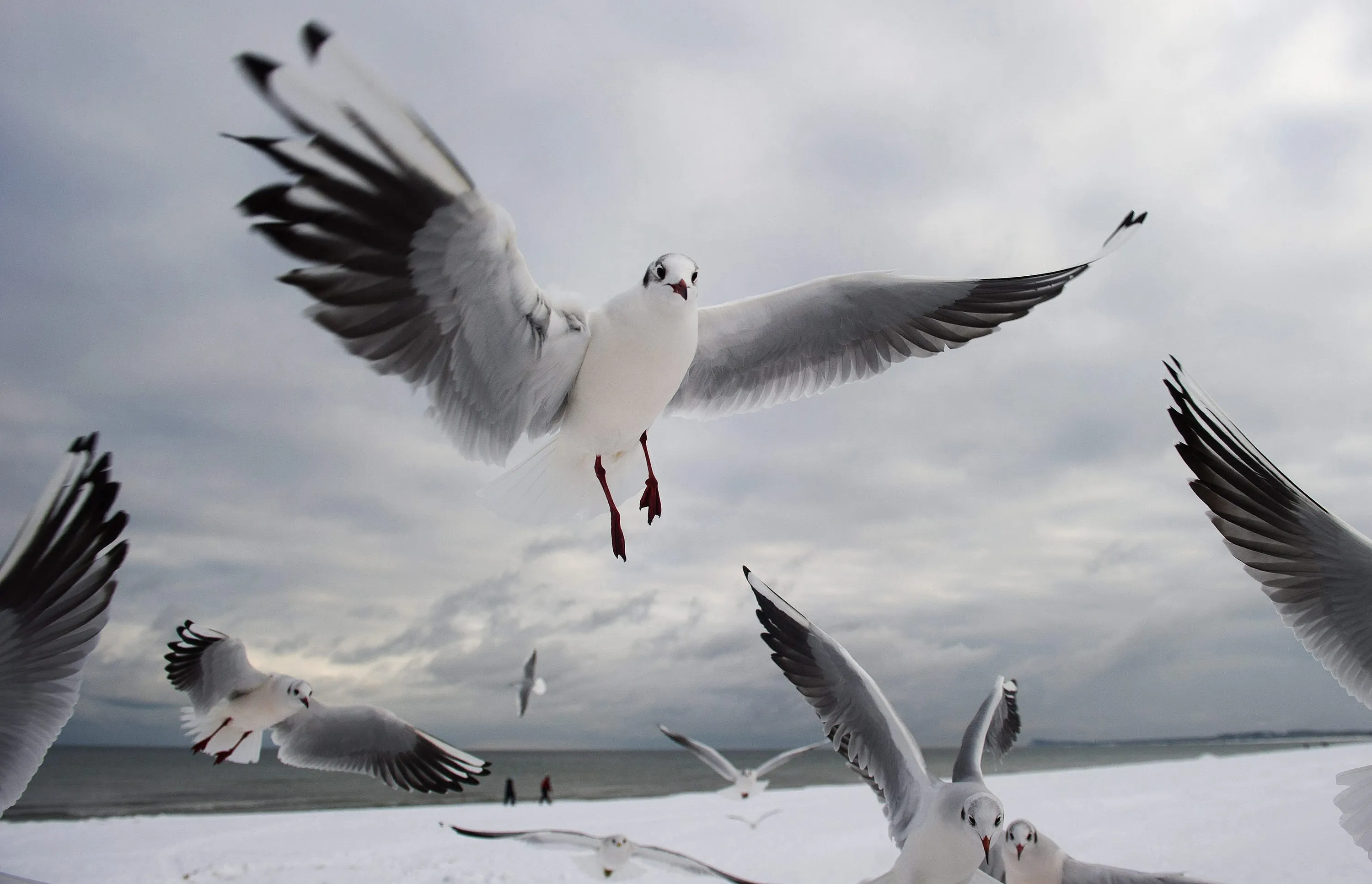 Seagulls fly above a Baltic Sea beach in Karlshagen, Germany, 3 February 2015. (Photo by Stefan Sauer/EPA)