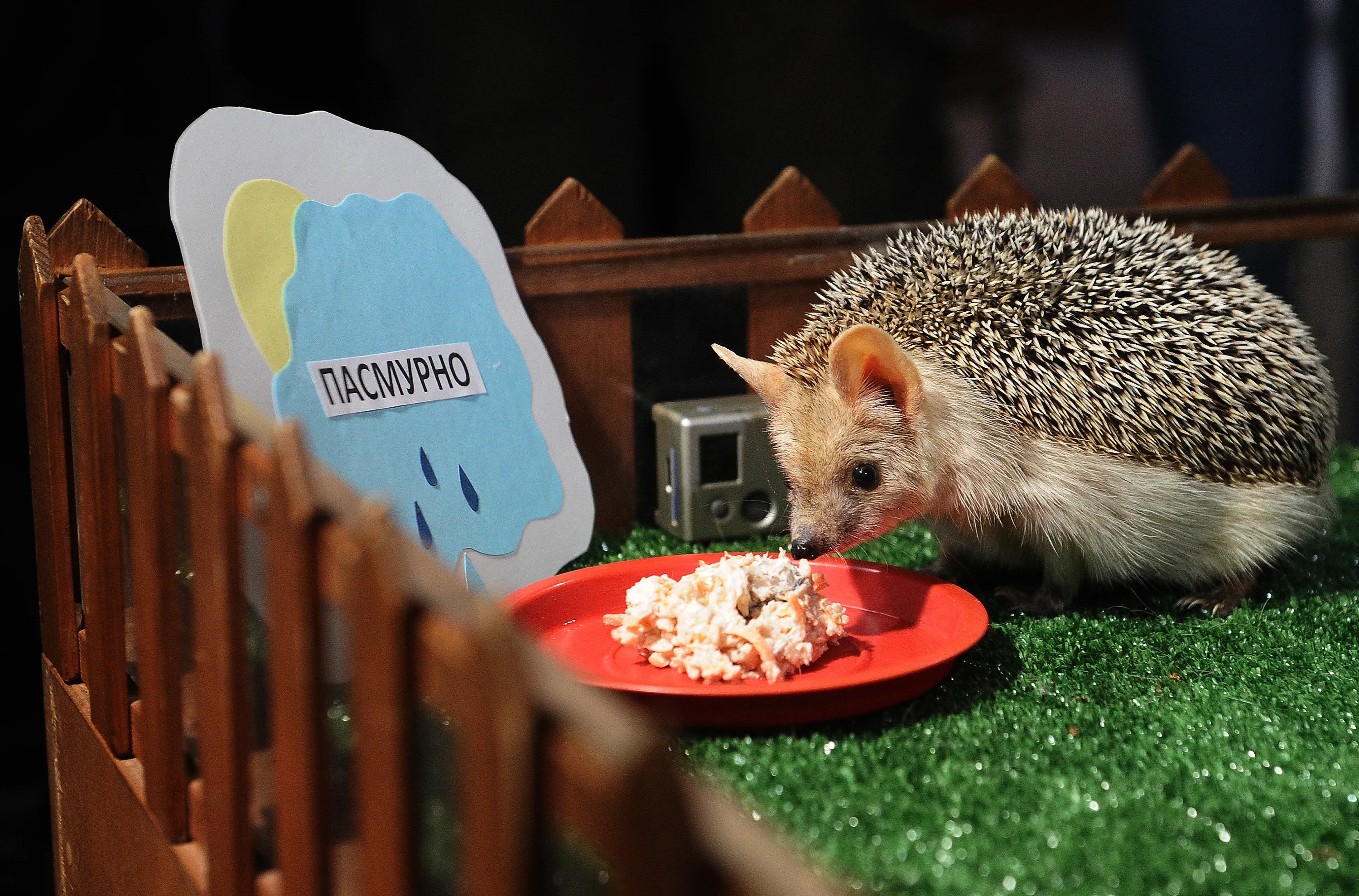 A hedgehog named Pugovka [Button] seen by a Cloudy sign in Yekaterinburg's Zoo, Russia, on February 2, 2015. Employees of the zoo predict the weather for the upcoming spring based on the hedgehog's behaviour. (Photo by Donat Sorokin/TASS/ZUMA Wire)
