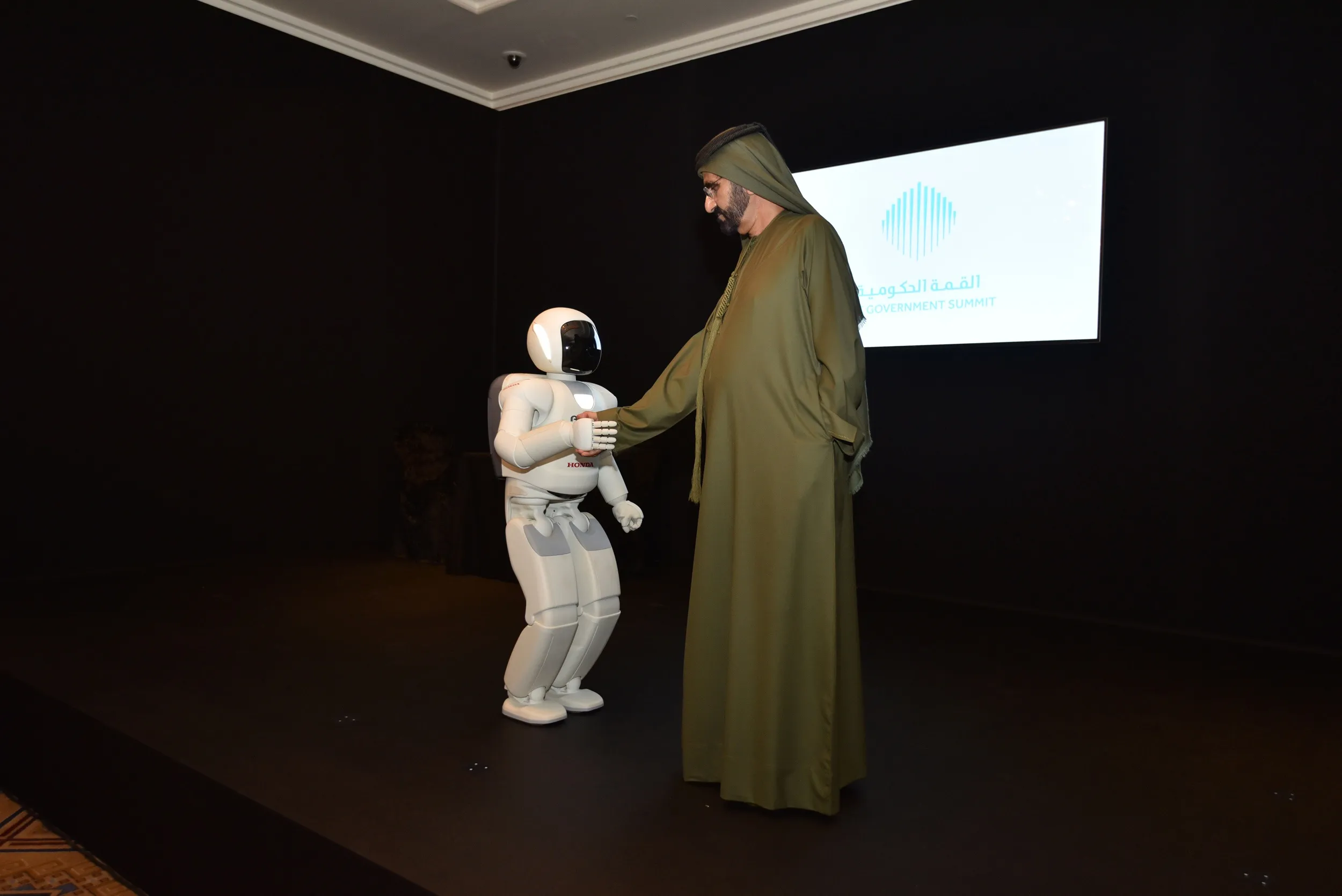 Sheikh Mohammed bin Rashid Al Maktoum, Vice-President and Prime Minister of the United Arab Emirates and ruler of Dubai, shakes hands with a robot as he inaugurates The Museum of Future Government Services, at the Government Summit in Dubai February 8, 2015. (Photo by Reuters/Prime Minister Media Office)