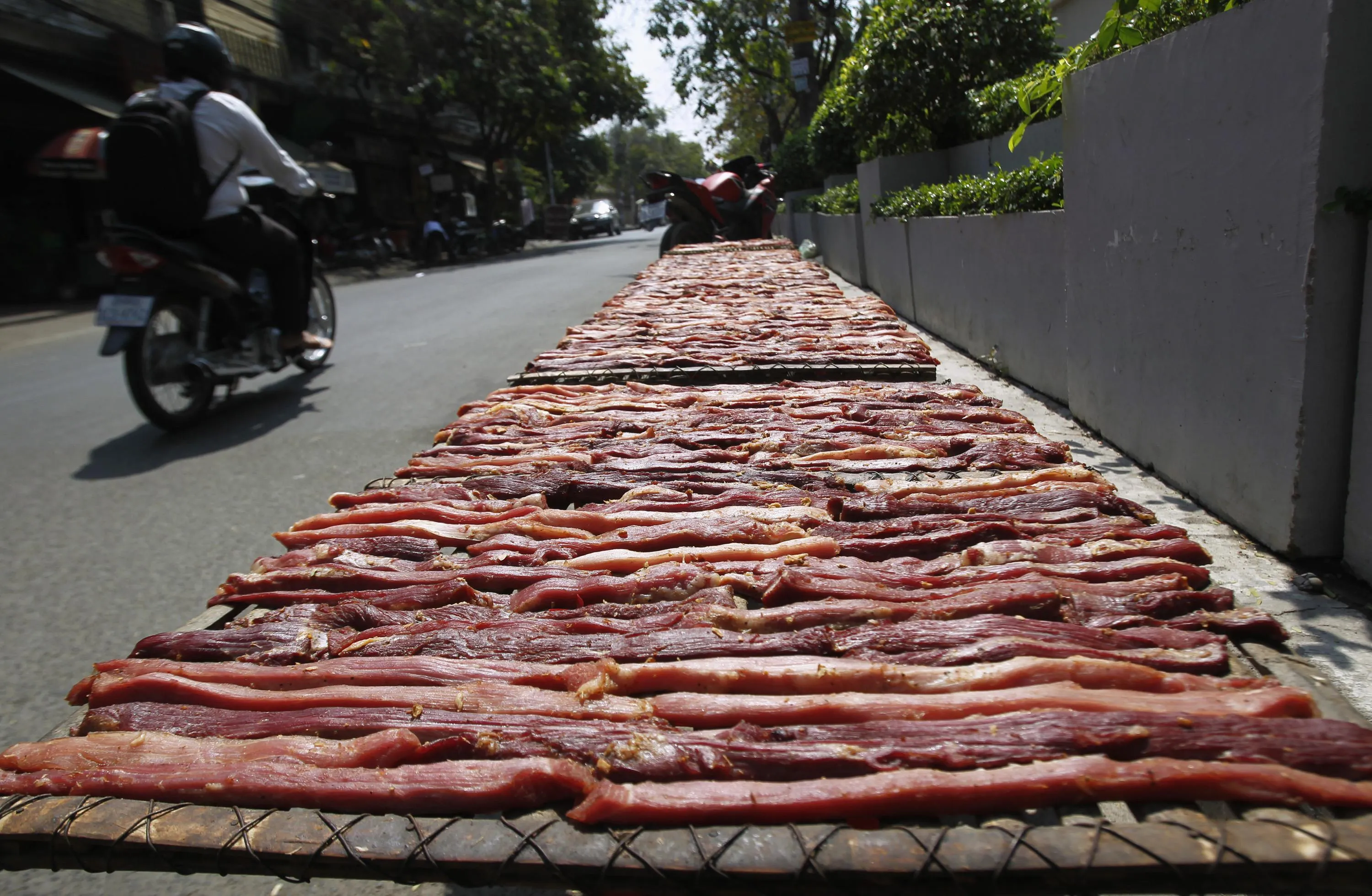 A man rides a motorcycle near dried buffalo meat laid out by a shopkeeper, along a street in central Phnom Penh February 9, 2015. The dried buffalo meat is sold for $2.50 per plate, according to the shopkeeper. (Photo by Samrang Pring/Reuters)