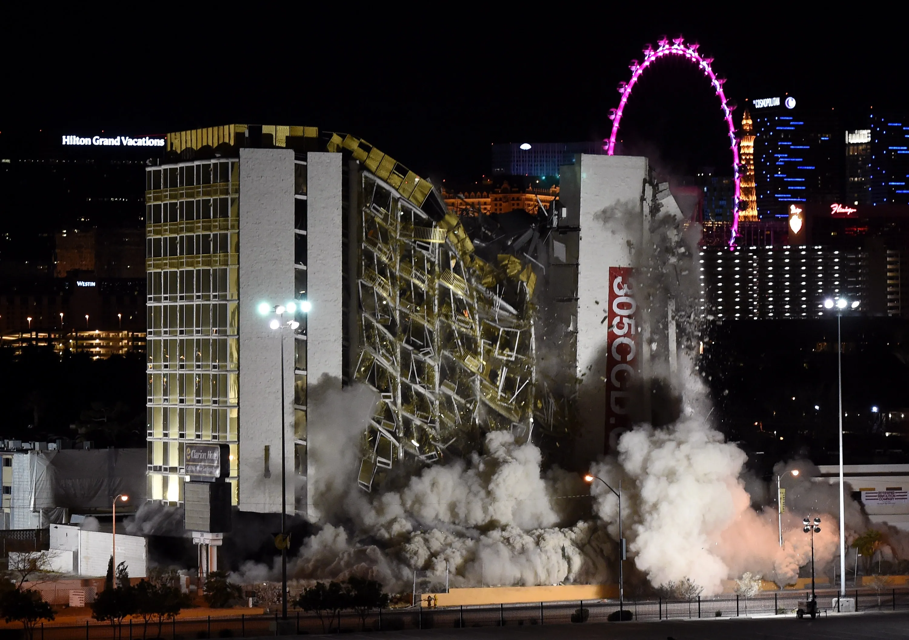 The Clarion Hotel and Casino is imploded on February 10, 2015 in Las Vegas, Nevada. It is the first casino implosion in Las Vegas since the New Frontier Hotel & Casino was brought down in 2007. The 12-story Clarion, located just off the Las Vegas Strip, opened in 1970 as the Royal Inn and changed ownership over the years becoming known by several names including the Royal Americana Hotel, The Paddlewheel Hotel Casino, the Debbie Reynolds Hollywood Hotel and the Greek Isles Hotel & Casino. The Clarion closed for good in September 2014, and was purchased for USD 22.5 million by Las Vegas developer Lorenzo Doumani who plans to turn the six-acre property into a mixed-use resort. (Photo by Ethan Miller/Getty Images)