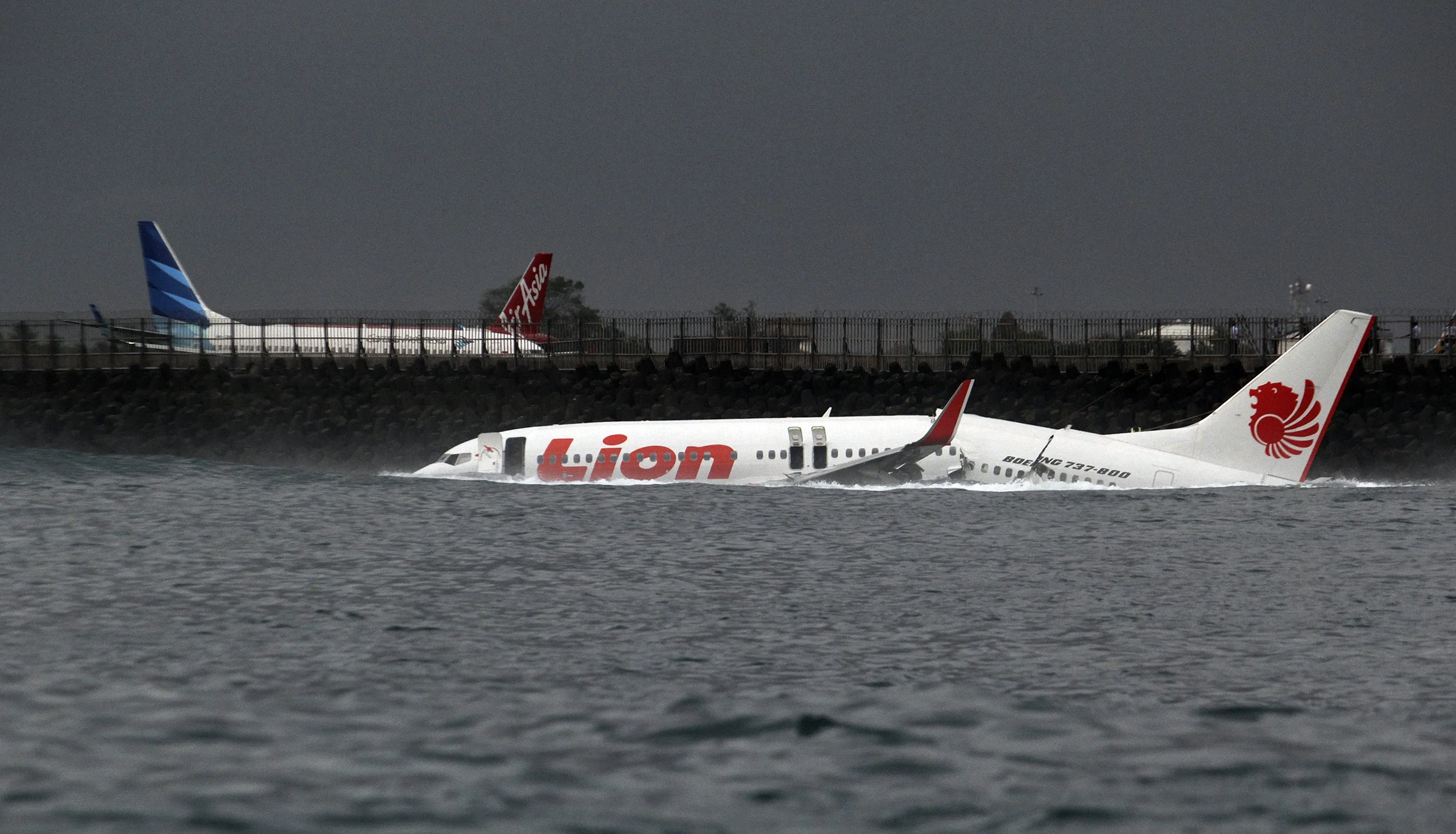 The body of a Lion Air plane is seen in the water after it missed the runway in Denpasar, Bali, in this file picture taken April 13, 2013. Pilot errors, inadequate crew training and lapses in emergency response procedures led to the plane operated by fast-growing budget carrier Lion Air crashing into the sea off Bali in April 2013, according to a final report into the incident. None of the 108 passengers and crew died in the incident, which took place as heavy rain affected visibility for the Boeing 737-800 on a scheduled flight from Bandung. Four people suffered serious injuries and the aircraft, which had been in service for less than two months with Lion Air, was written off. (Photo by Reuters/Stringer)