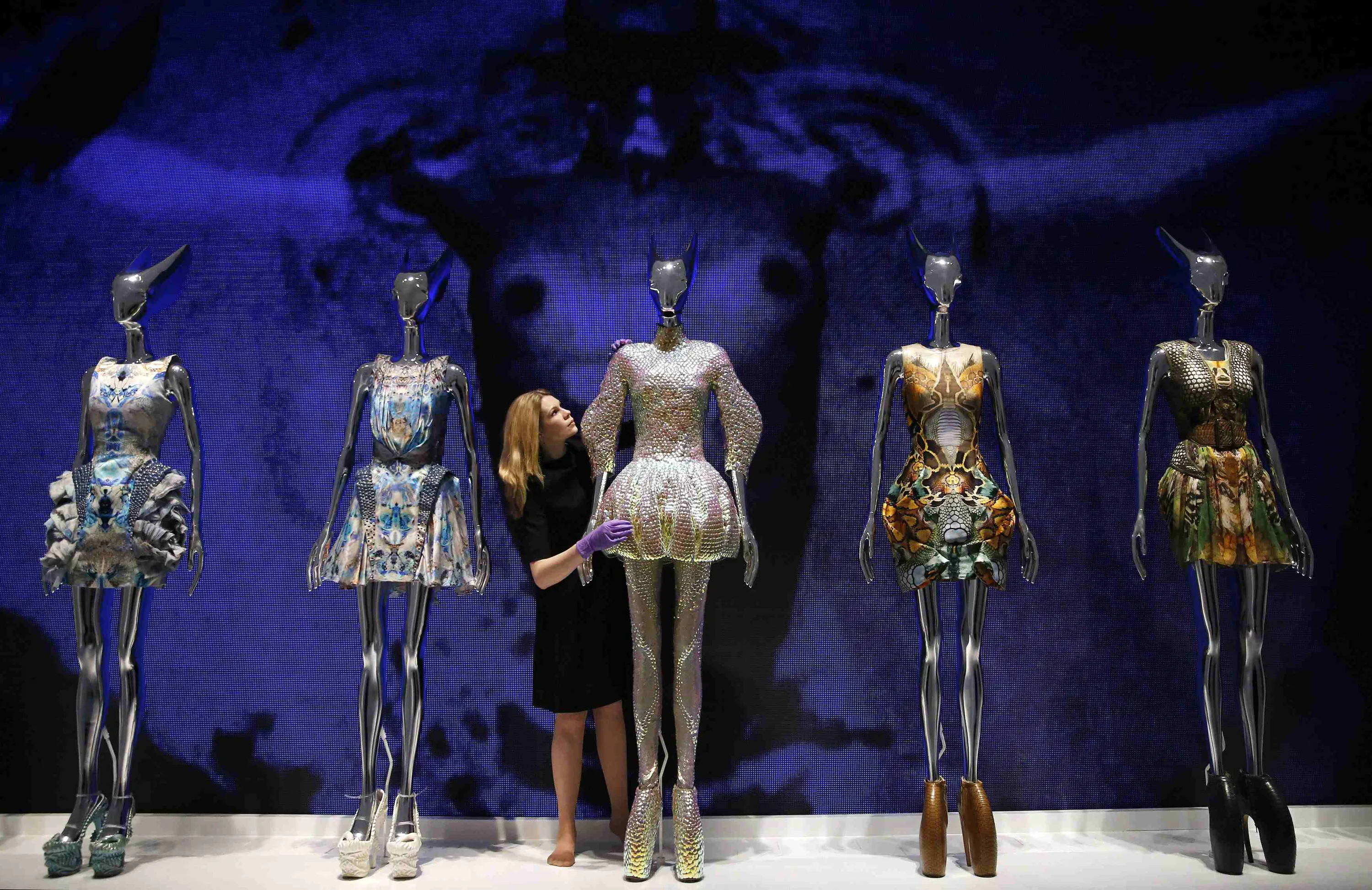A staff member poses with dresses from the Alexander McQueen Plato's Atlantis spring/summer 2010 collection in the Alexander McQueen: Savage Beauty exhibition at the V&A in London, March 12, 2015. (Photo by Suzanne Plunkett/Reuters)