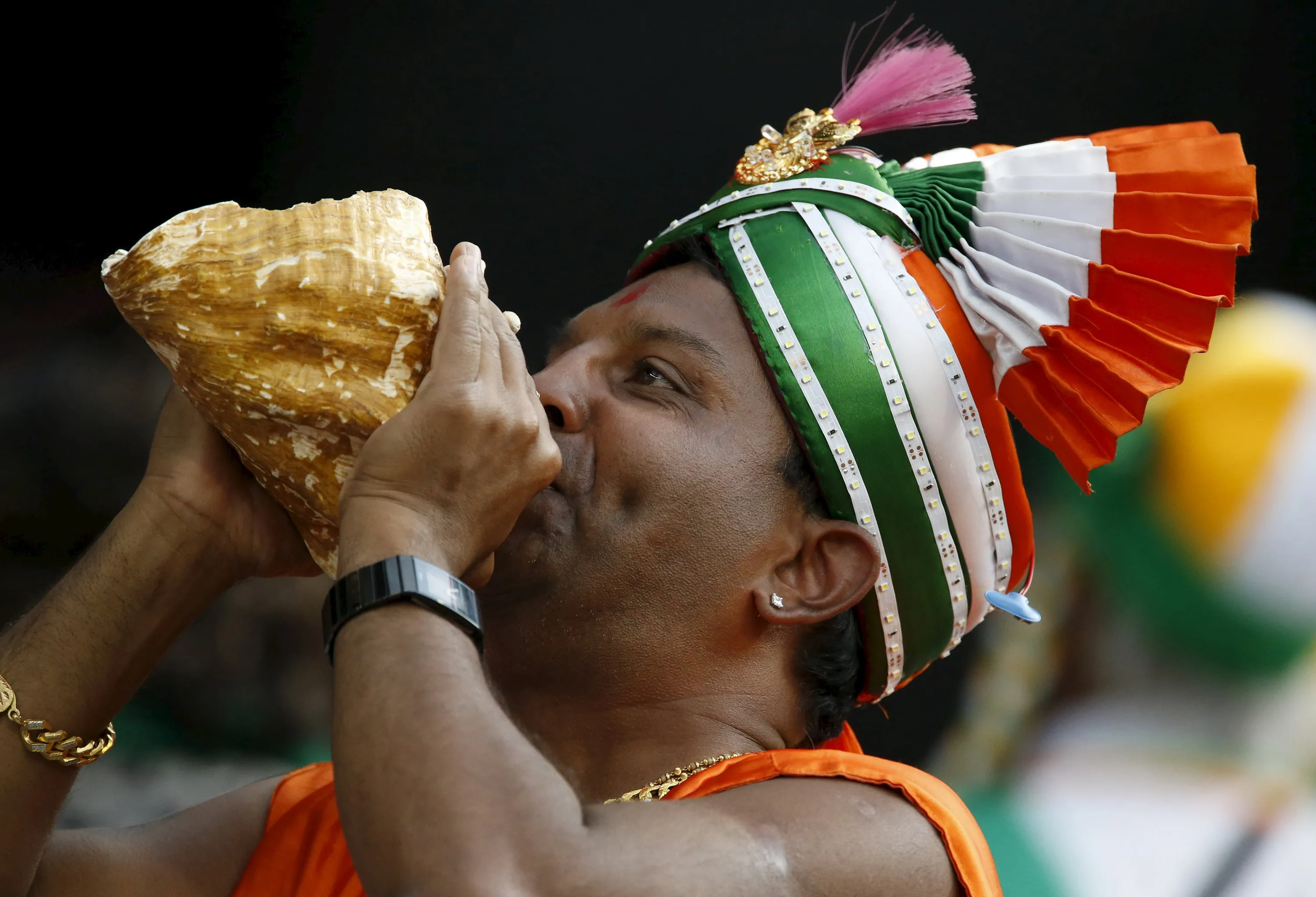A fan of India's cricket team blows into a sea shell during their Cricket World Cup quarter final match against Bangladesh in Melbourne, March 19, 2015. (Photo by Brandon Malone/Reuters)