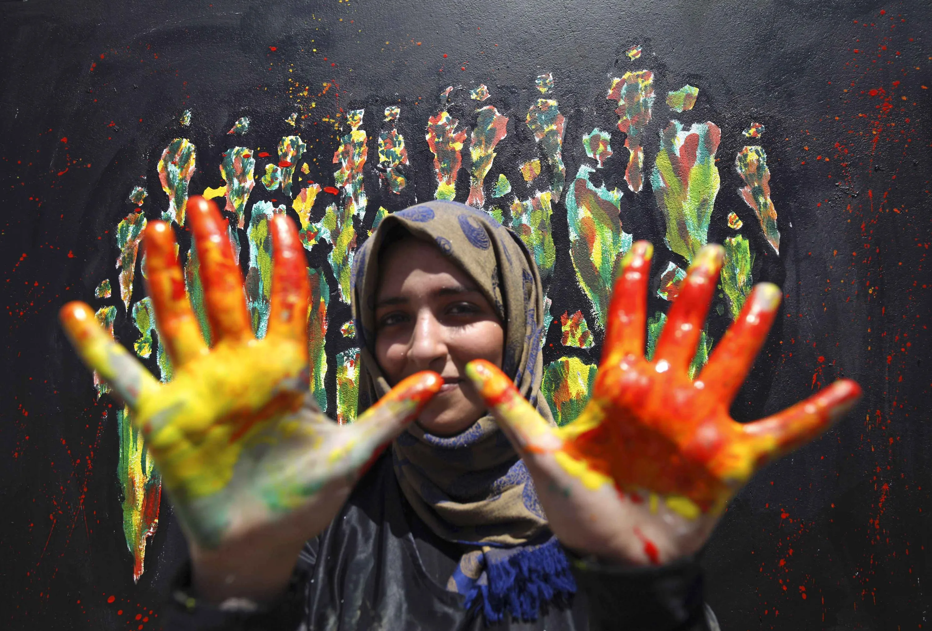 An artist shows her hands after working on a wall as part of a campaign to call for coexistence and the renouncement of violence through the painting of walls in Sanaa, Yemen March 15, 2015. (Photo by Mohamed al-Sayaghi/Reuters)