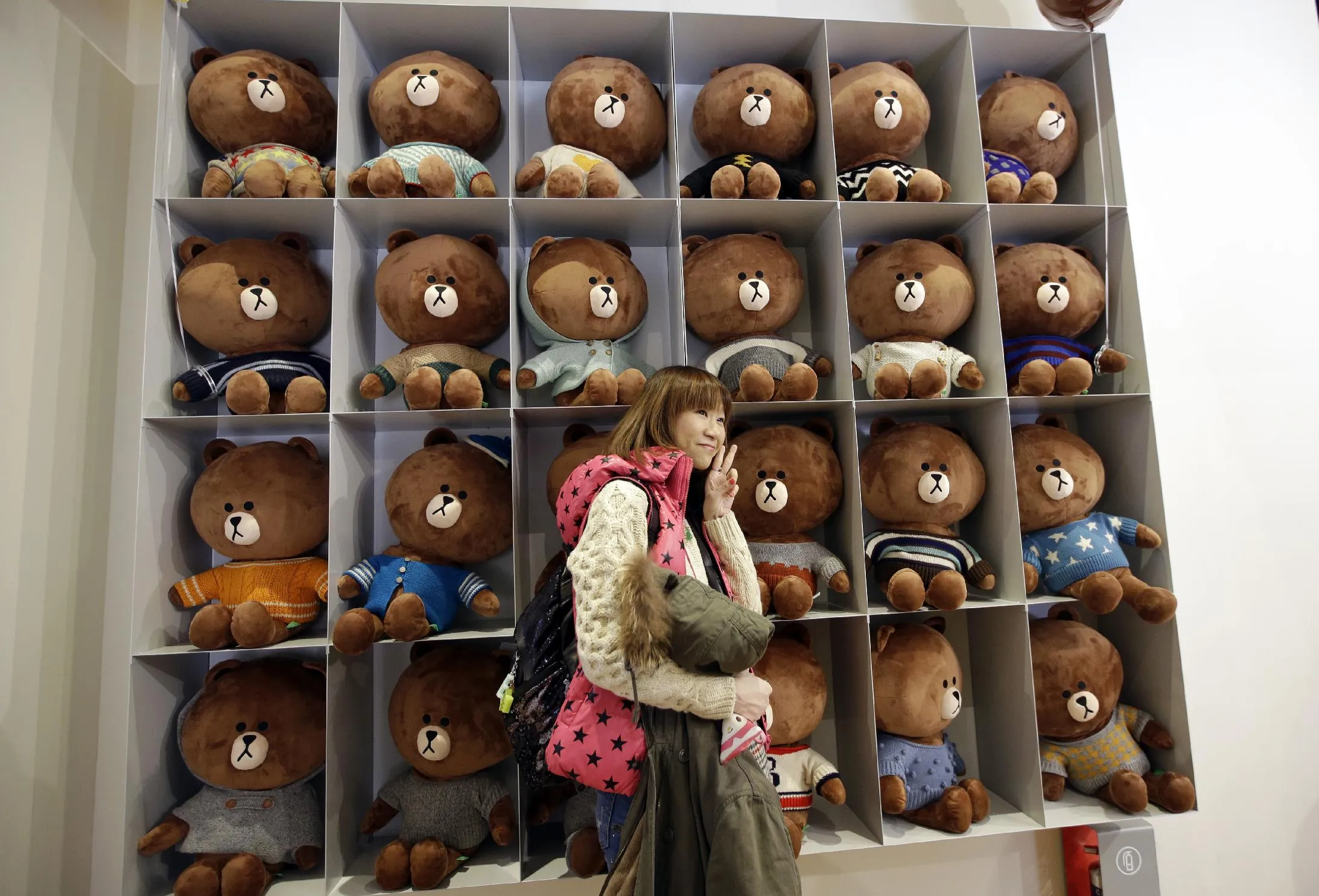 In this March 16, 2015 photo, a tourist from Hong Kong poses for her souvenir photo in front of Line’s character Brown bear at the Line Friends flagship shop in Seoul, South Korea. For smartphone users in Asia where most of Line’s 181 million monthly users are located, the characters are as familiar as Hello Kitty or Disney’s animated stars. They are not well known in America or Europe but owner Line Corp. hopes to change that. It plans to open 100 stores selling Brown dolls and other cute “Line Friends” paraphernalia worldwide over the next three years as a way to draw more users to the app. (Photo by Lee Jin-man/AP Photo)