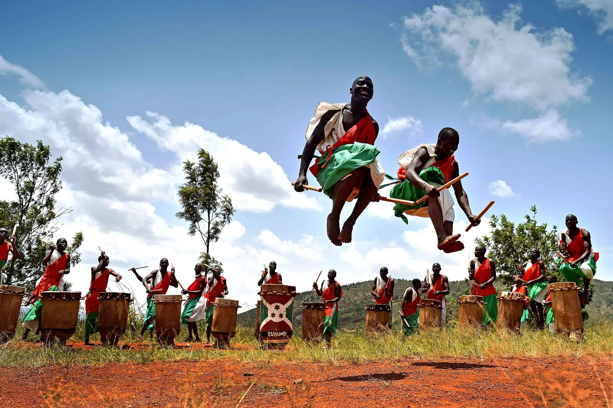 Drummers from the Gishora drumming group perform in Gishora on March 14, 2015. The group's leader, Anthime Baranshakaje used to perform for Burundi's King Mwambutsa. The tradtion is being kept alive as the group now perform internationally and for dignitaries and Burundi's President. Burundi's royal drum was late last year given Intangible Cultural Heritage staus by the United Nations Educational, Scientific and Cultural Organization (UNESCO). (Photo by Carl de Souza/AFP Photo)