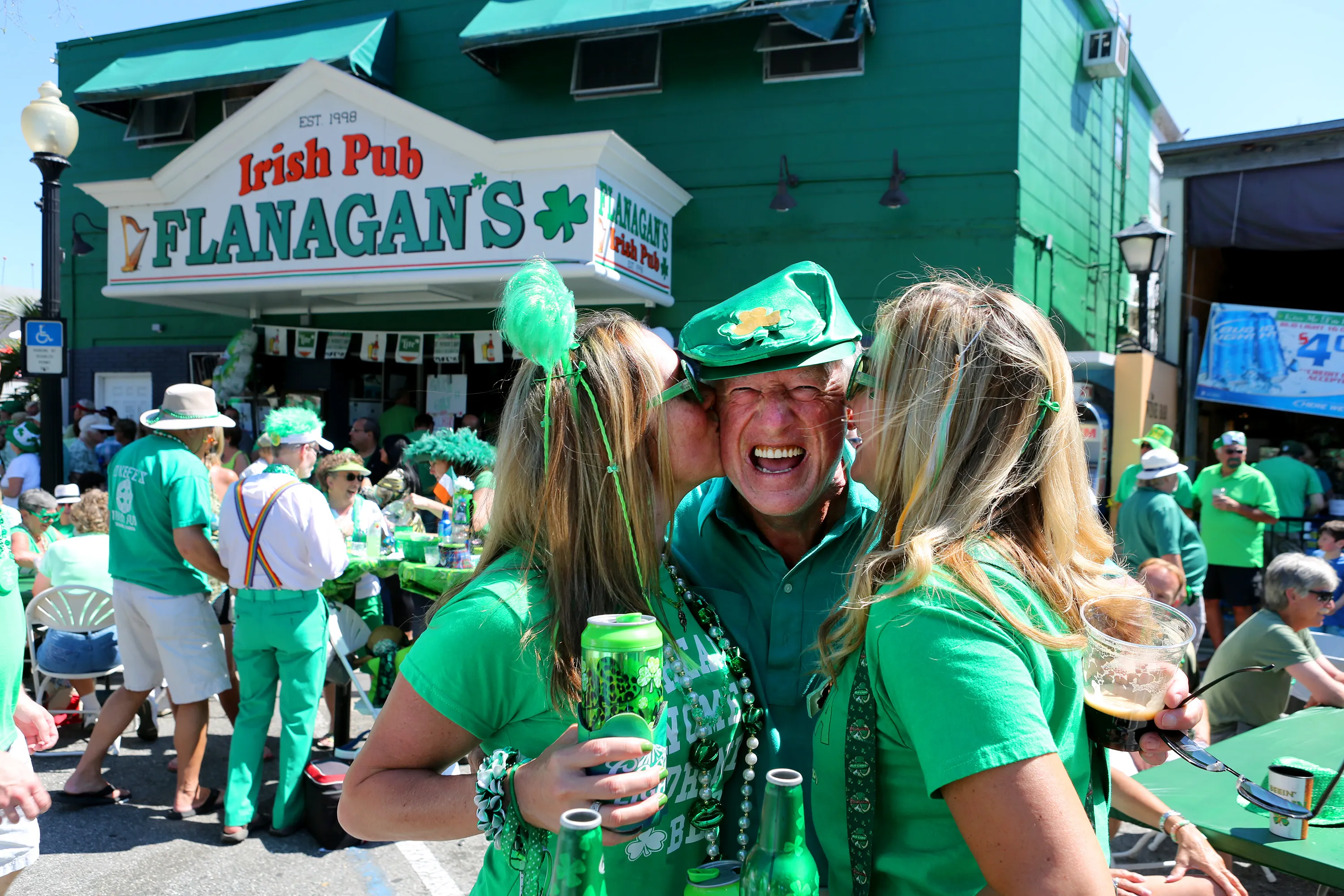 Maurice Harquail, of Ottawa, Canada, center, gets a couple pecks on his cheek from friends Heidi Watson, of Port Richey, left, and Kerry Kinsalla, of Port Richey, while attending Flanagan's Irish Pub's 2015 Saint Patrick's Day Street Festival on Tuesday, March 17, 2015, in downtown Dunedin, Fla. The annual party is celebrated with live music, bagpipers, Irish step dancers, traditional Irish food and beer. (Photo by Douglas R. Clifford/AP Photo/Tampa Bay Times)