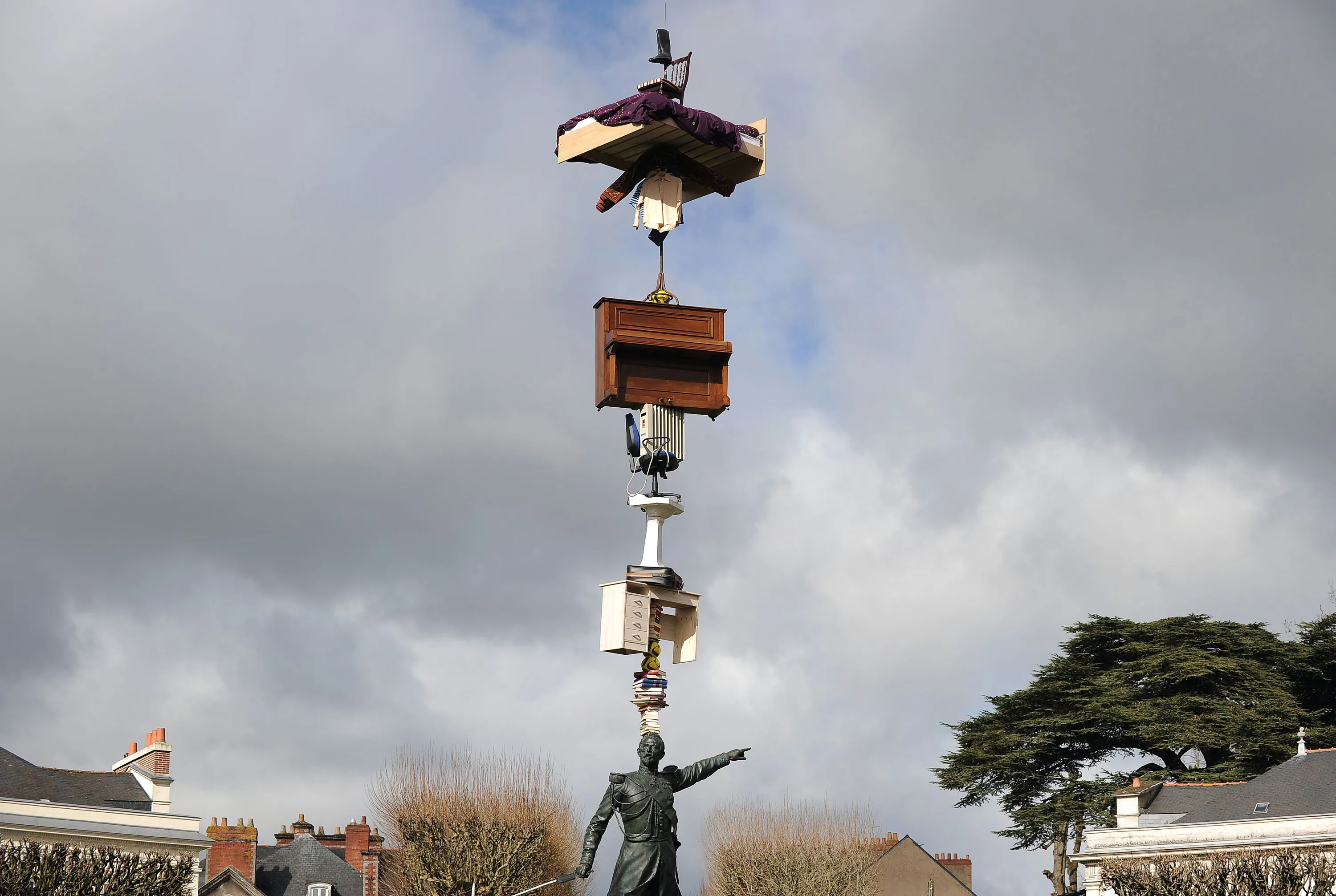 An ephemeral creation of Japanese artist Tatzu Nishi is pictured above the statue of French General Mellinet on March 13, 2015 in Nantes, western France, 4 months before the “A journey to Nantes” (Le Voyage a Nantes) art festival. The event will run from July 3 to August 30, 2015. (Photo by Jean-Sebastien Evrard/AFP Photo)