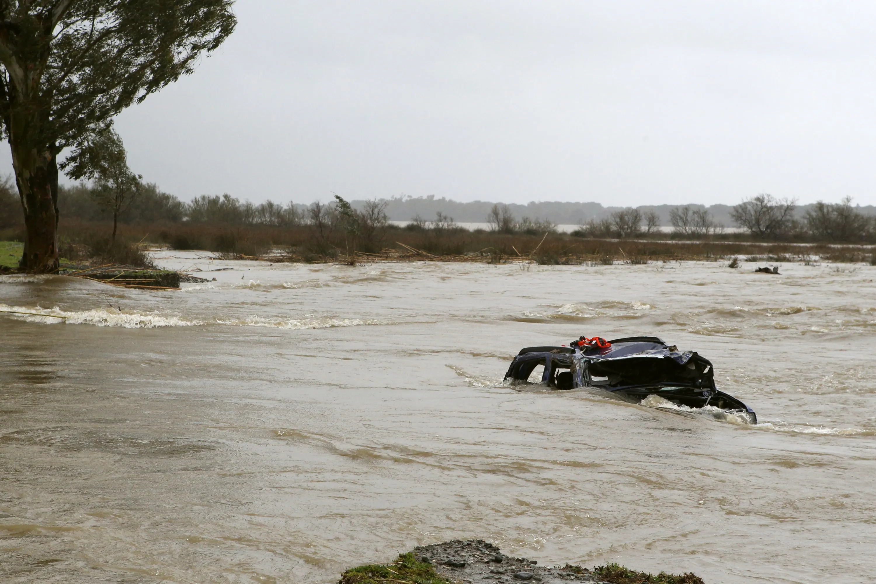 The wreckage of a car sits in flood waters in Biguglia on the French Mediterranean island of Corsica on March 17, 2015. Rescue teams are still looking for the driver. (Photo by Pascal Pochard-Casabianca/AFP Photo)