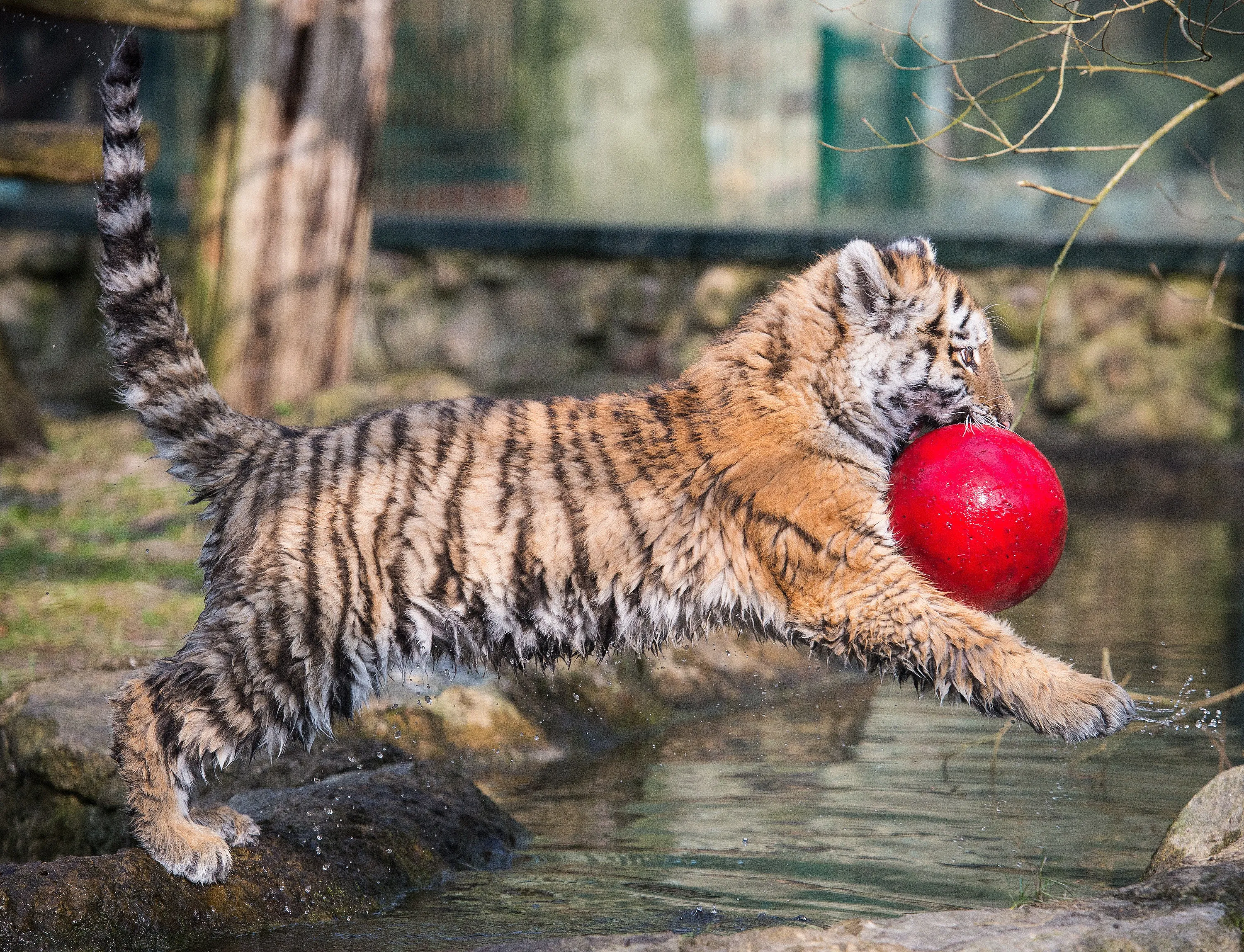 A baby tiger Dragan plays on March 10, 2015 in its enclosure at Eberswalde's zoo. (Photo by Patrick Pleul/AFP Photo/DPA)