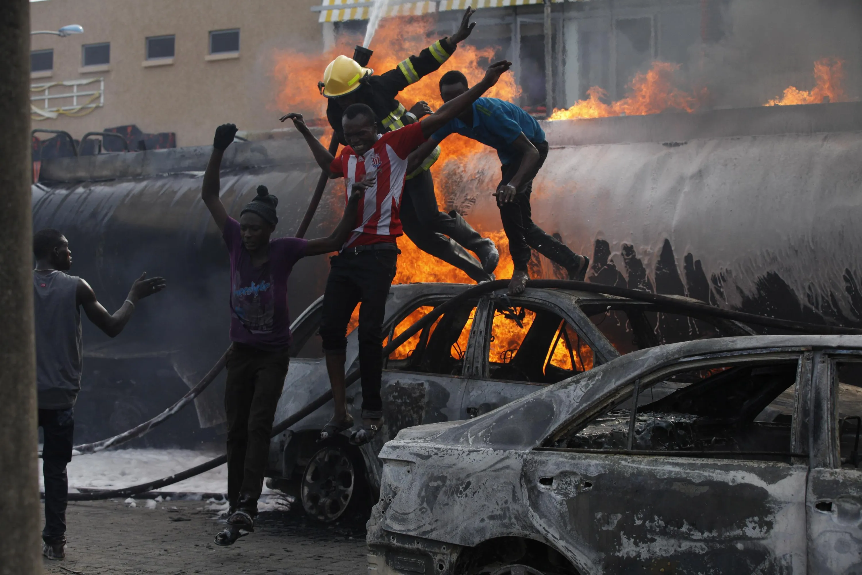 A firefighter and helpers flee as the try to contain a fire at a petrol station in Lagos, Nigeria on Thursday, March 26, 2015. (Photo by Sunday Alamba/AP Photo)