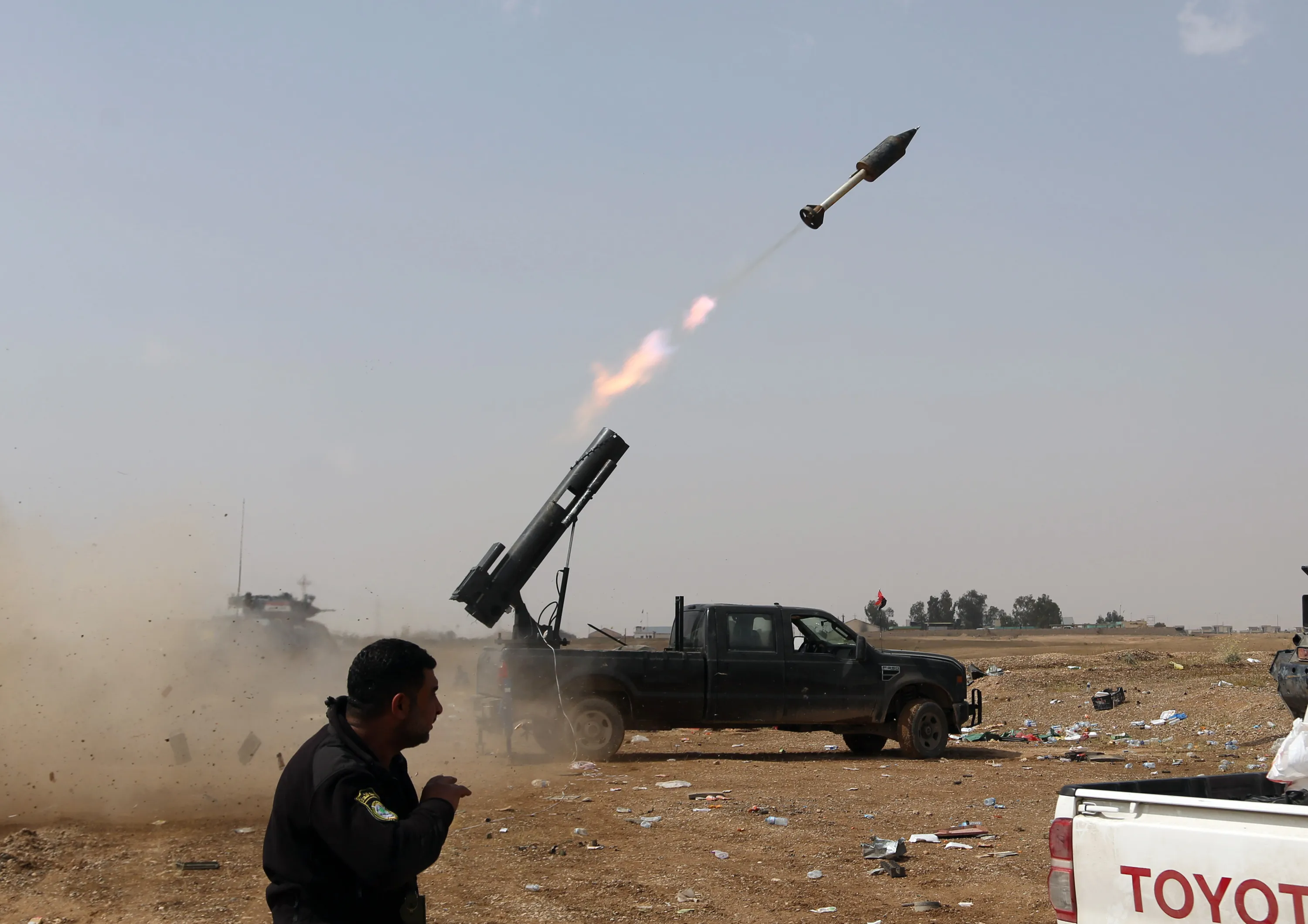 Iraqi security forces launch a rocket against Islamic State extremist positions during clashes in Tikrit, 130 kilometers (80 miles) north of Baghdad, Iraq, Monday, March 30, 2015. (Photo by Khalid Mohammed/AP Photo)