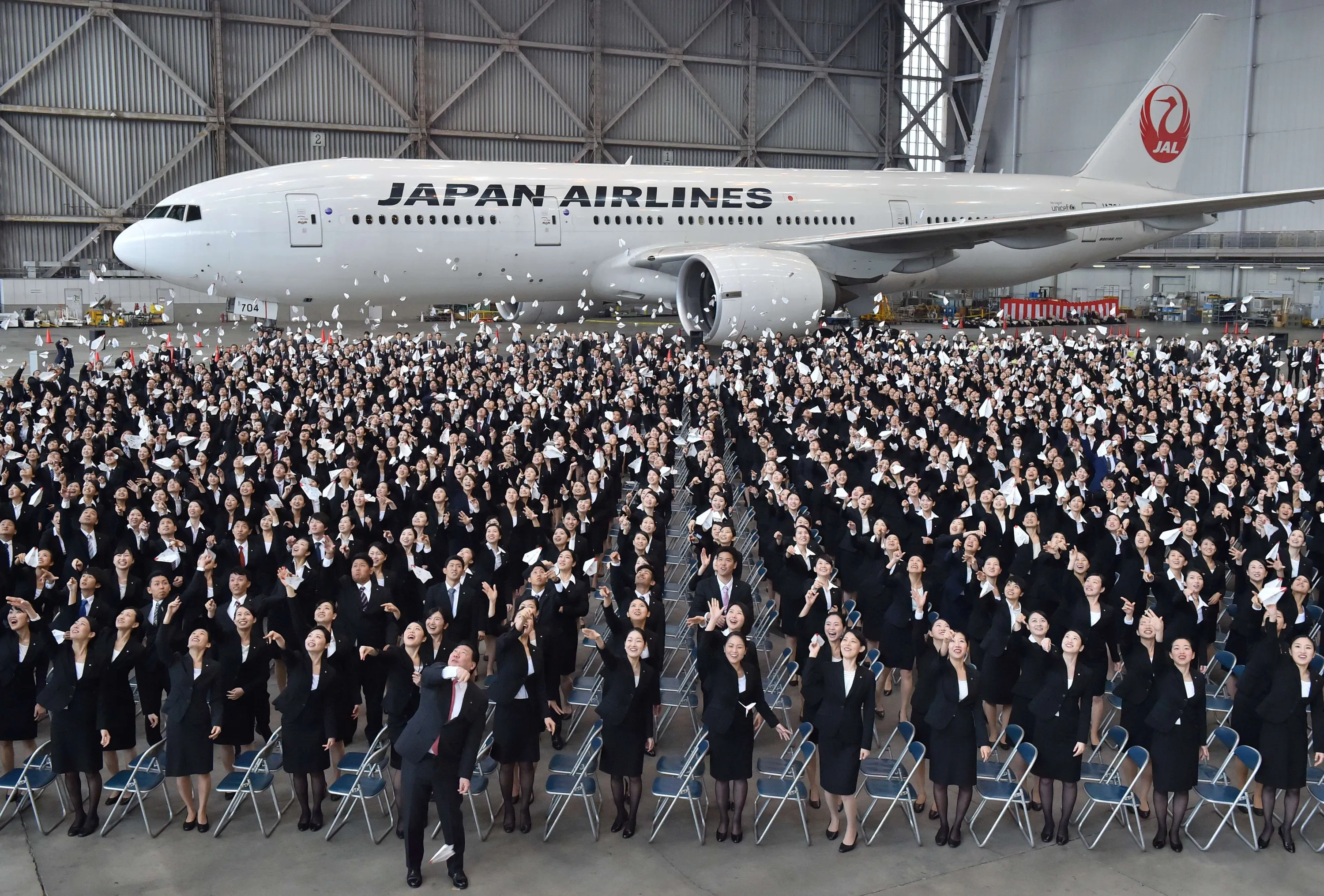 Japan Airlines (JAL) President Yoshiharu Ueki (front, C) and new employees of JAL Group toss carefully folded paper airplanes into the air during the entrance ceremony at a hangar with a Boeing 777 in Tokyo on April 1, 2015. (Photo by Kazuhiro Nogi/AFP Photo)