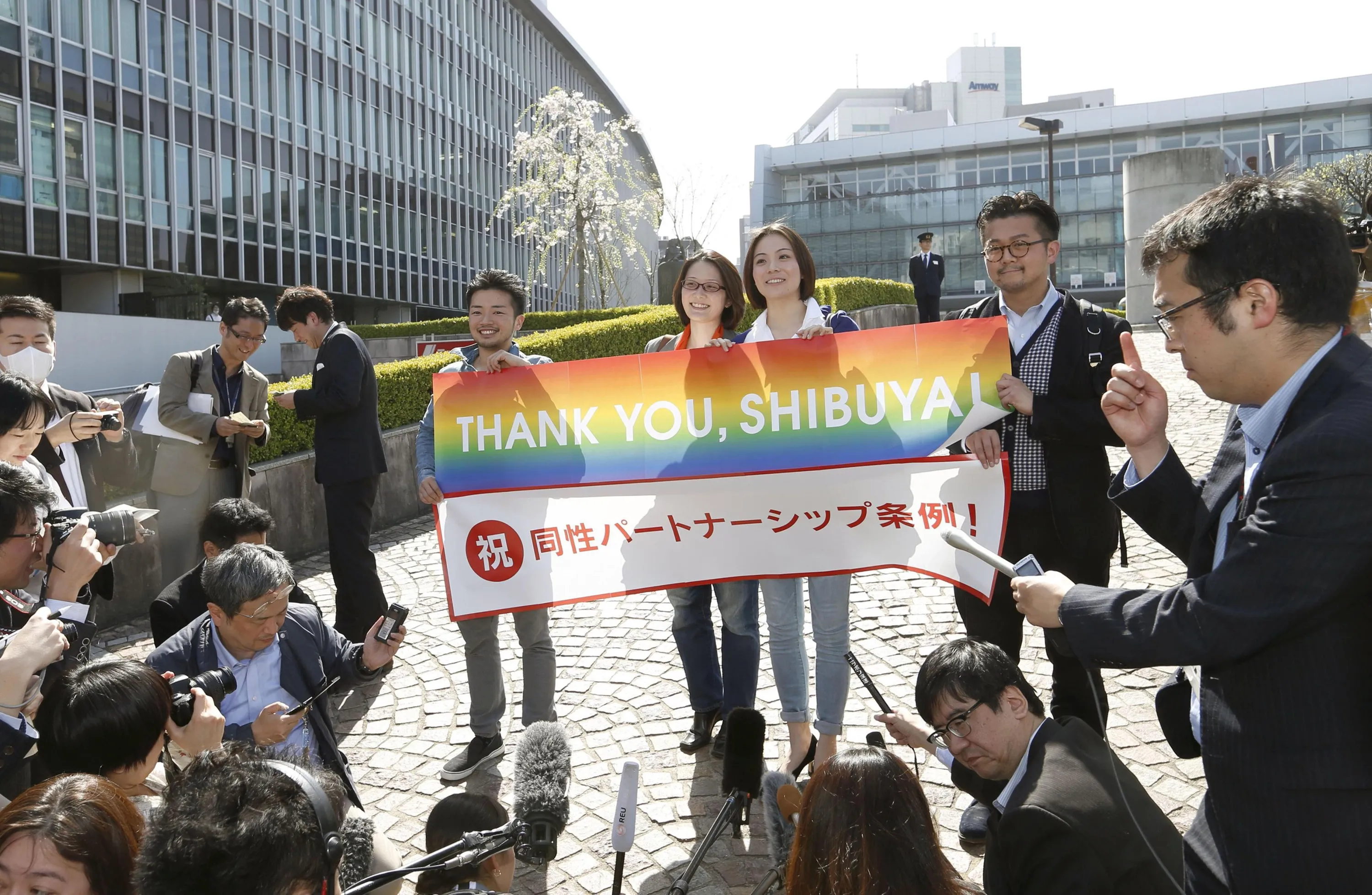 Lesbian activists Hiroko Masuhara (centre L) and her partner Koyuki Higashi (centre R) speak to the media with transgender activist Fumino Sugiyama (L) and gay activist Gon Matsunaka after Tokyo's Shibuya ward recognises same-sex partnerships, outside the Shibuya city hall in Tokyo in this photo taken by Kyodo March 31, 2015. A district assembly in Tokyo became the first in Japan on Tuesday to recognise same-sex partnerships, a major step forward for gay couples in a country where being openly gay remains taboo. (Photo by Reuters/Kyodo News)