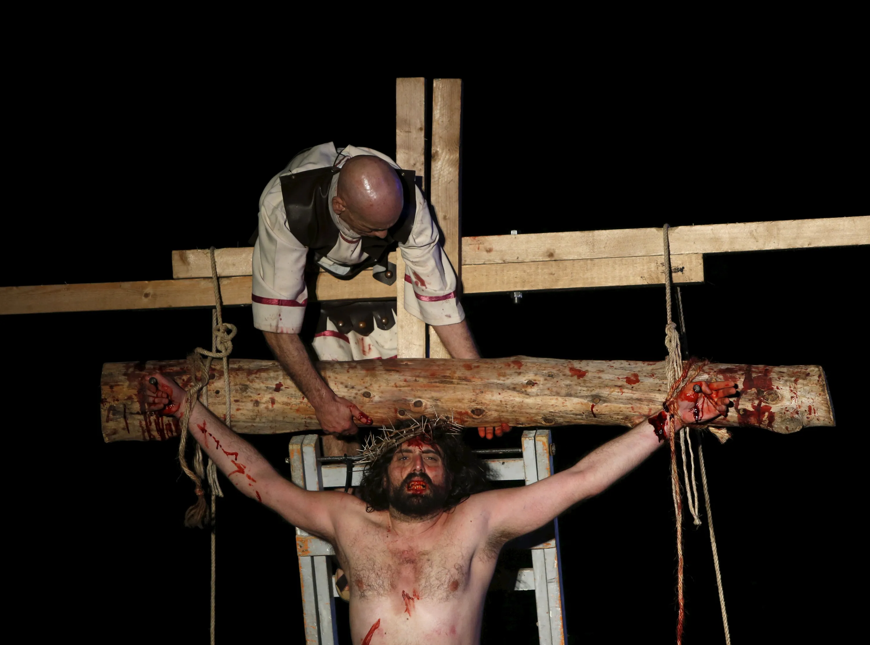 An actor portraying the crucified Jesus Christ takes part in the interactive street-theatre performance of Il-Mixja (The Way) in Attard, outside Valletta, March 31, 2015. The Passion play was held in the grounds of Mount Carmel Mental Hospital as part of a series of Holy Week activities in the run-up to Easter taking place all over Malta. (Photo by Darrin Zammit Lupi/Reuters)