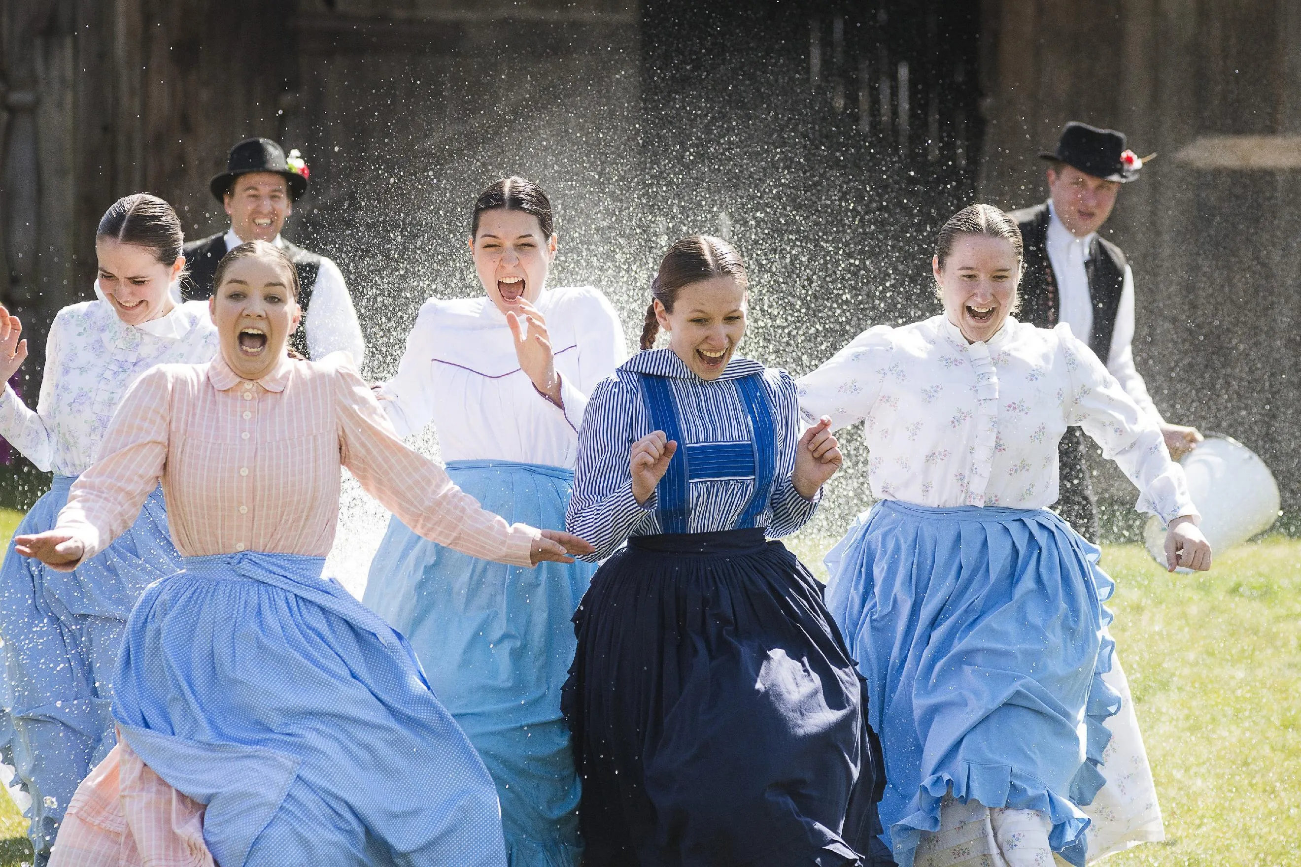 Dressed in folk costumes young women run away because young men pour water from their buckets on them as members of Nyirseg Dance Group perform Easter folk traditions in the Museum Village in Nyiregyhaza, 227 kms northeast of Budapest, Hungary, Monday, April 6, 2015. (Photo by Attila Balazs/AP Photo/MTI)