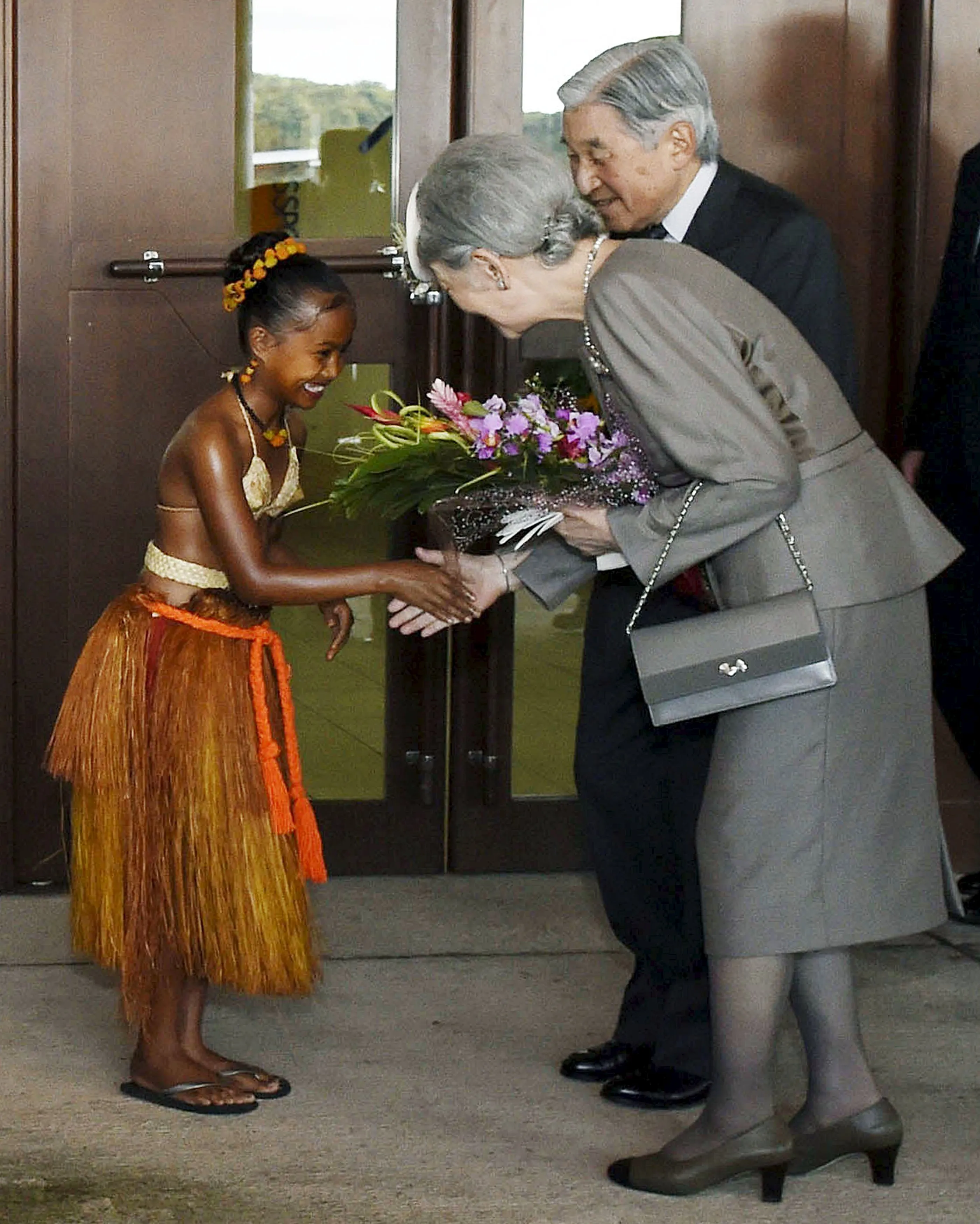 Japan's Emperor Akihito (R) and Empress Michiko (front, R) receive flowers from a local girl upon their arrival at Palau international airport in Airai on Palau's Babelthuap Island, in this photo released by Kyodo April 8, 2015. Emperor Akihito arrived the island nation of Palau on Wednesday where he will visit a World War Two battlefield, the latest journey in his efforts to soothe the wounds of a conflict that haunts Asia 70 years after its end. (Photo by Reuters/Kyodo News)