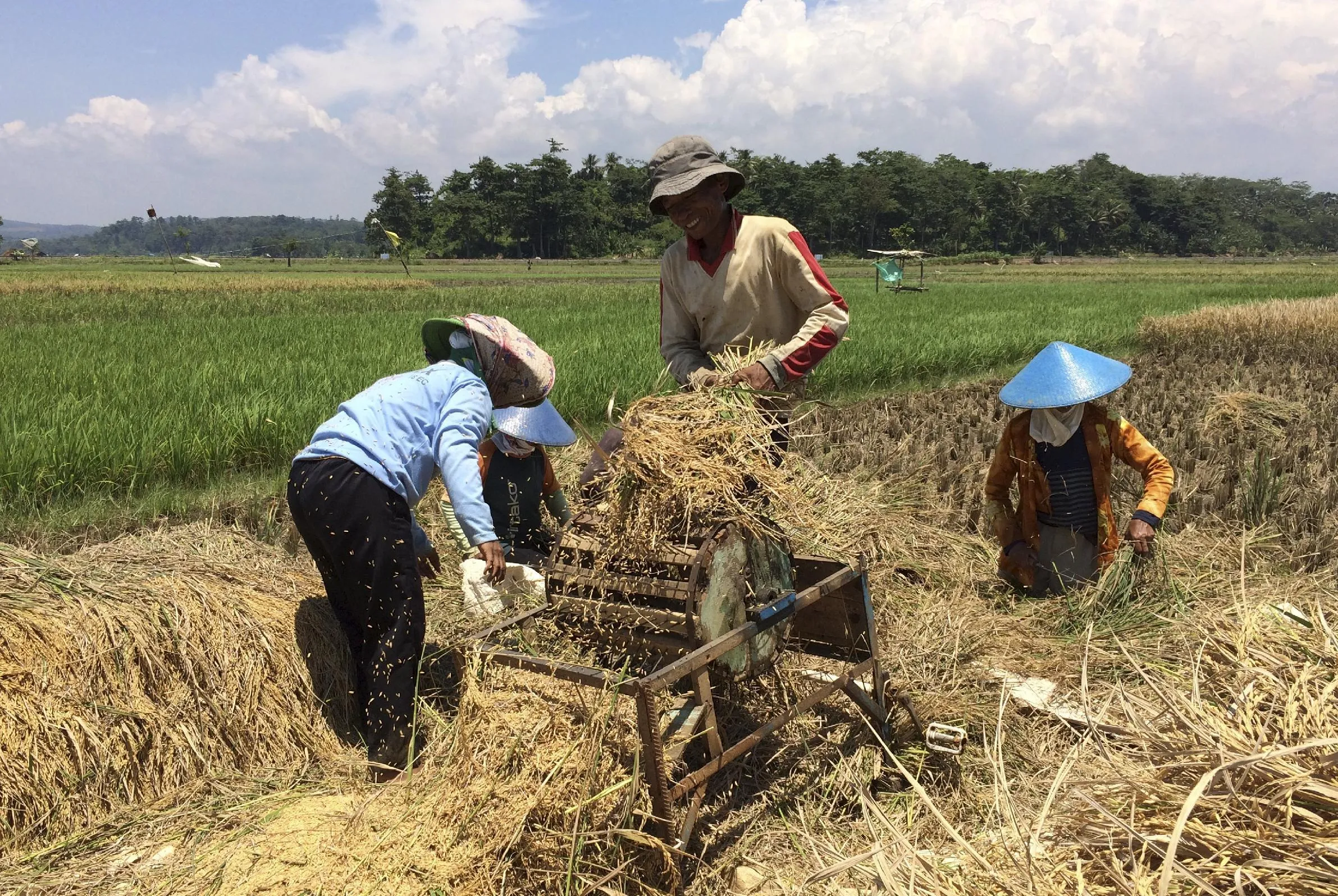 Farmers harvest rice on land earmarked for one of Southeast Asia's largest power stations near Ujungnegoro in Batang regency, West Java March 27, 2015. Announced with great fanfare in 2011, a coal-fired power plant to be built on the island of Java at a cost of $4 billion was billed as the biggest project of its kind in Southeast Asia – and an answer to Indonesia's crippling power problems. But dozens of landowners in the central Java regency of Batang are having none of it: they are refusing to give up their rice paddy fields to make way for the plant. (Photo by Fergus Jensen/Reuters)