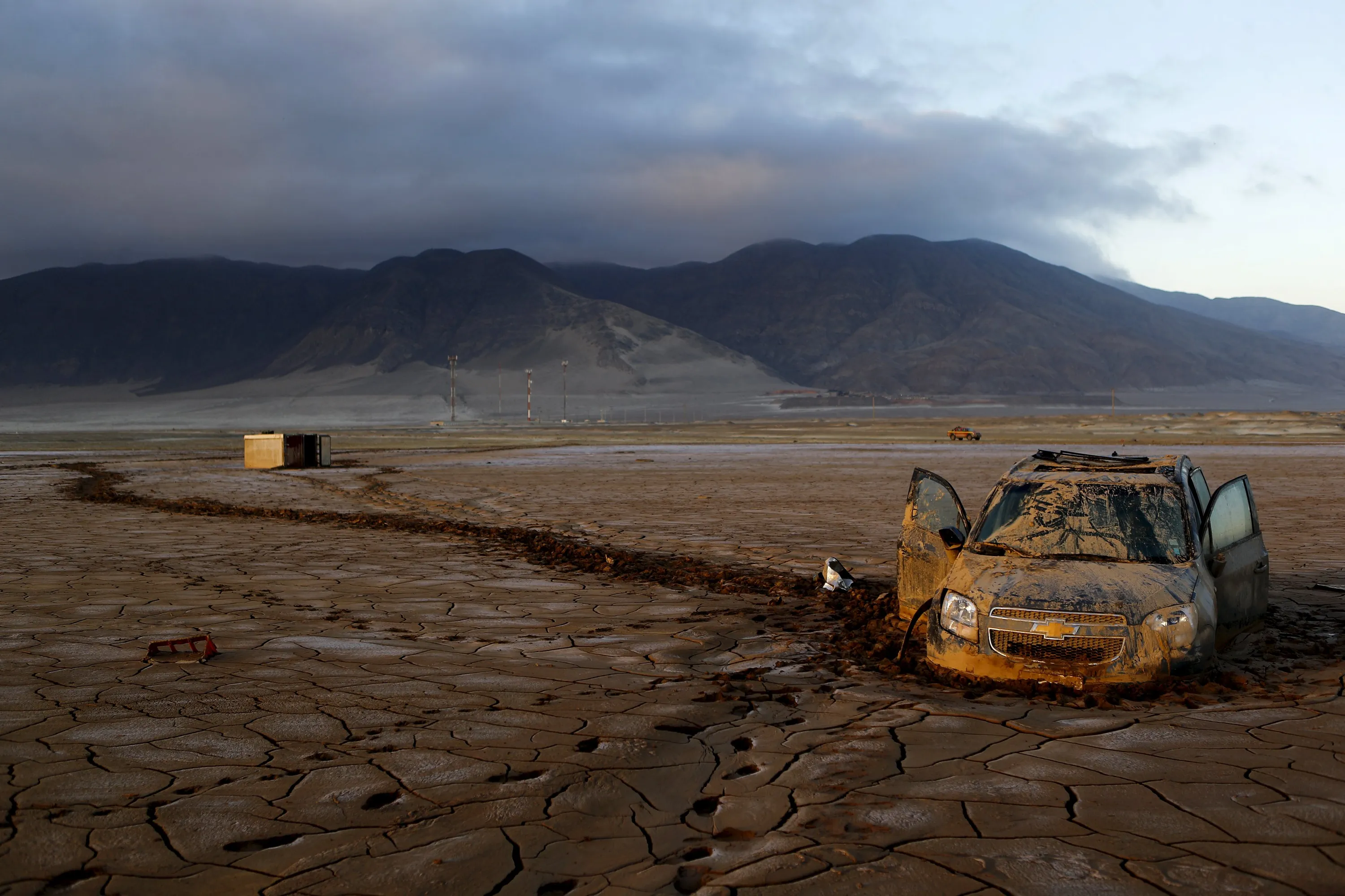 A vehicle partially submerged in dry mud is pictured in an area that was hit by floods at Chanaral town, April 8, 2015. Chile was hit by heavy rains and floods at the end of March. (Photo by Ivan Alvarado/Reuters)
