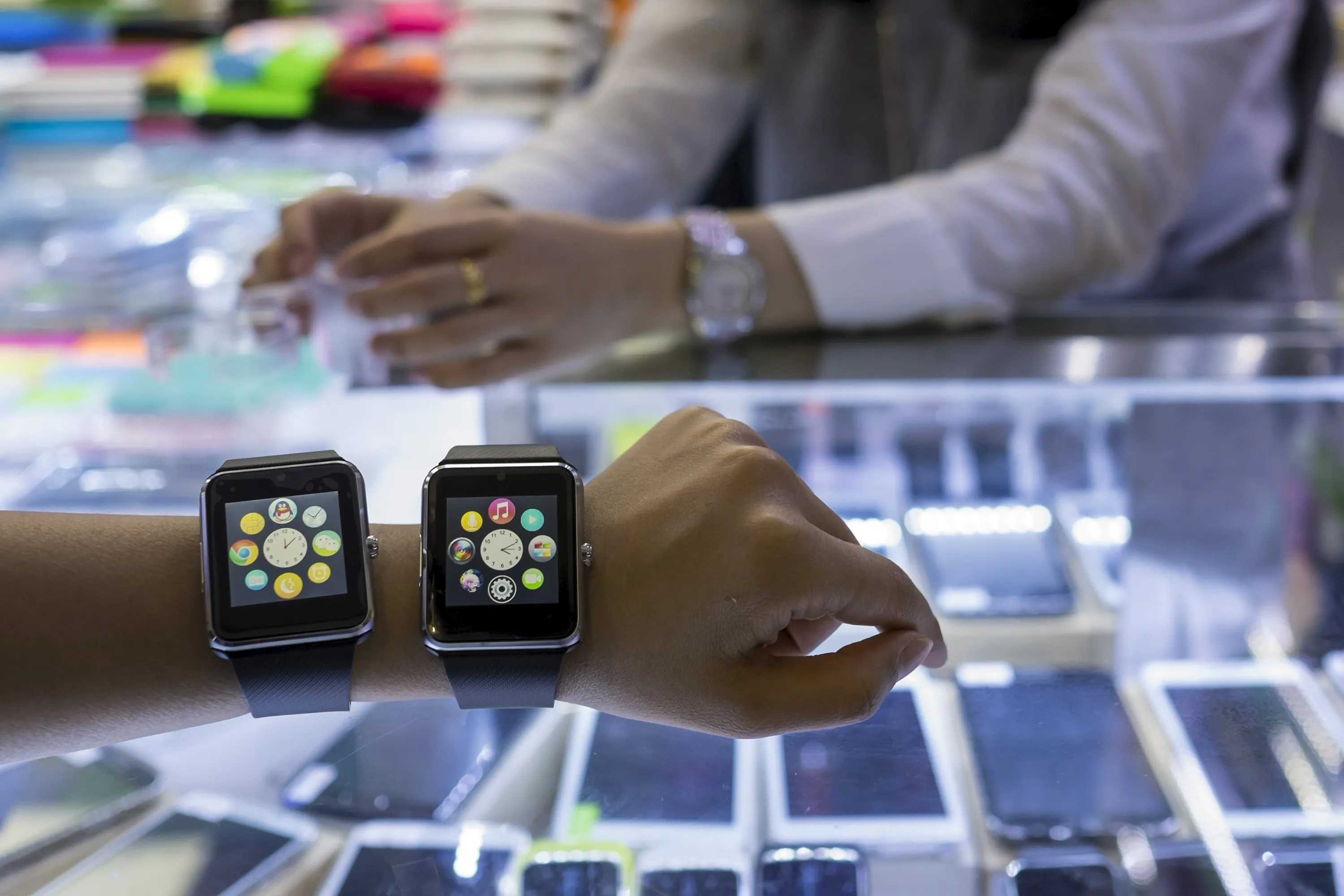 A salesman poses with two Apple Watch look-alike devices, made by a Chinese manufacturer, at a mall selling electronic products in China's southern city of Shenzhen April 8, 2015. The device can connect to Apple's iPhone products via bluetooth for calls and message alerts, along with playing music from a connected iPhone. It also accepts a SIM card to make calls and a micro SD card for storage. Included with pre-installed apps and a built-in camera, the device sells between RMB320 (US$41) and RMB550 (US$70.5), according to the manufacturer. Apple Watch, the first new product to be launched by Apple under Chief Executive Tim Cook, will hit stores on April 24, 2015. (Photo by Tyrone Siu/Reuters)