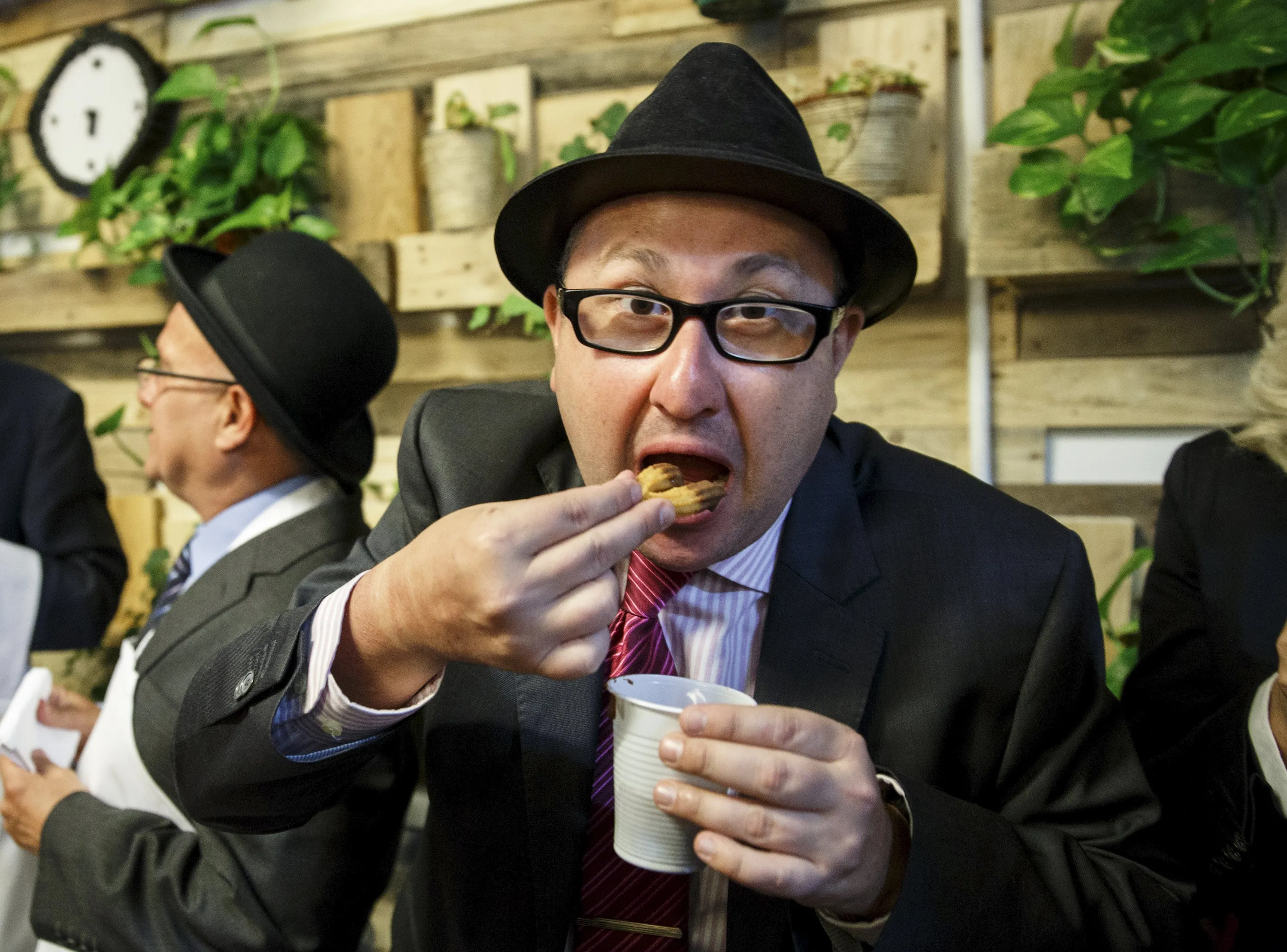 A man poses as he celebrates International Fun at Work Day at a co-working office with “Churrotherapy” in Madrid, April 9, 2015. Workers took time off to share hot chocolate with churros, a typical Spanish breakfast, consisting of a mixture of water and flour, deep fried in oil and sold fresh. International Fun at Work Day is typically celebrated on April 1. (Photo by Andrea Comas/Reuters)
