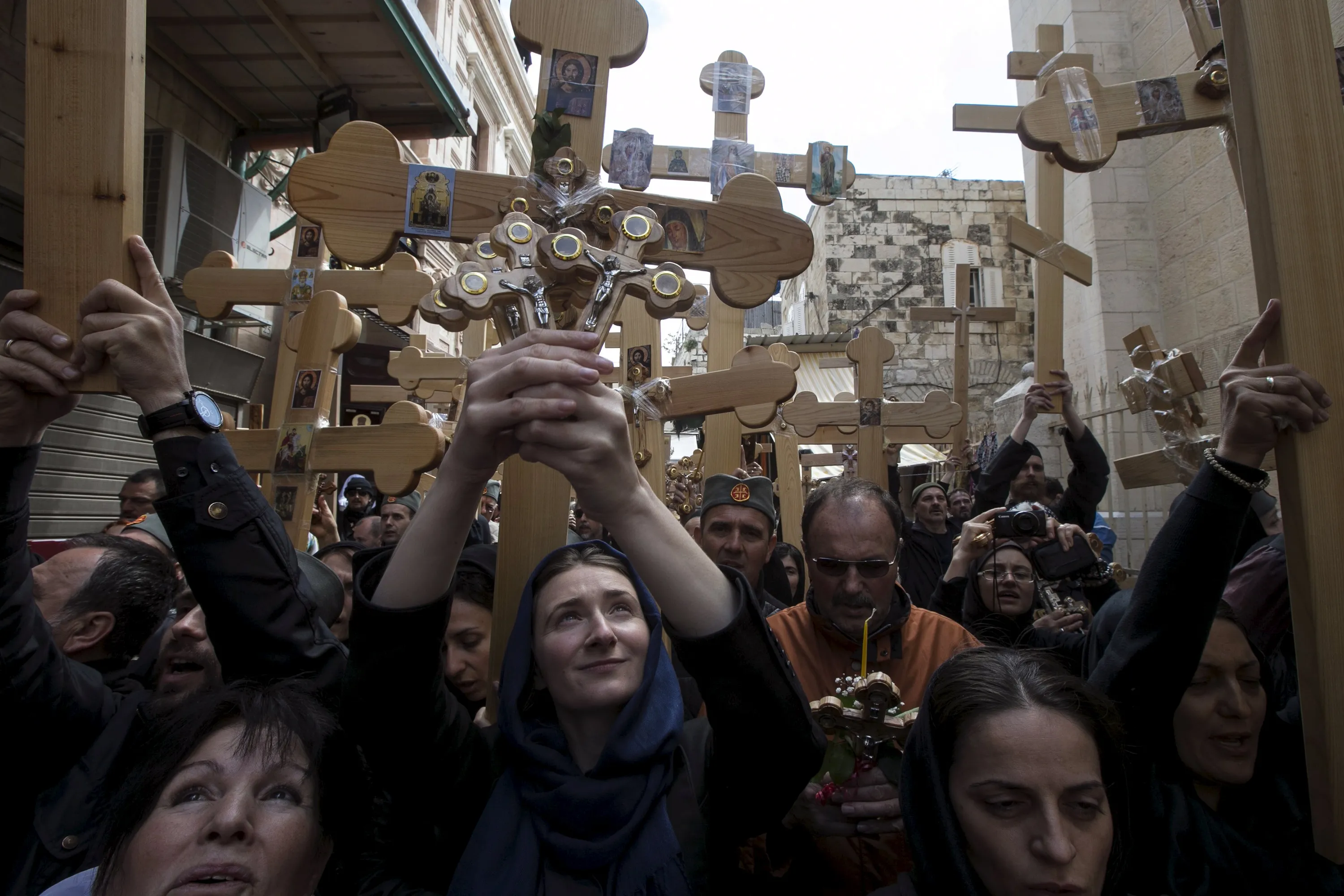 Orthodox Christian worshippers from Serbia hold crosses as they walk along Via Dolorosa during the Holy Week Good Friday procession in Jerusalem's Old City April 10, 2015. Christian worshippers on Friday retraced the route Jesus took along Via Dolorosa to his crucifixion in the Church of the Holy Sepulchre. Holy Week is celebrated in many Christian traditions during the week before Easter. (Photo by Baz Ratner/Reuters)