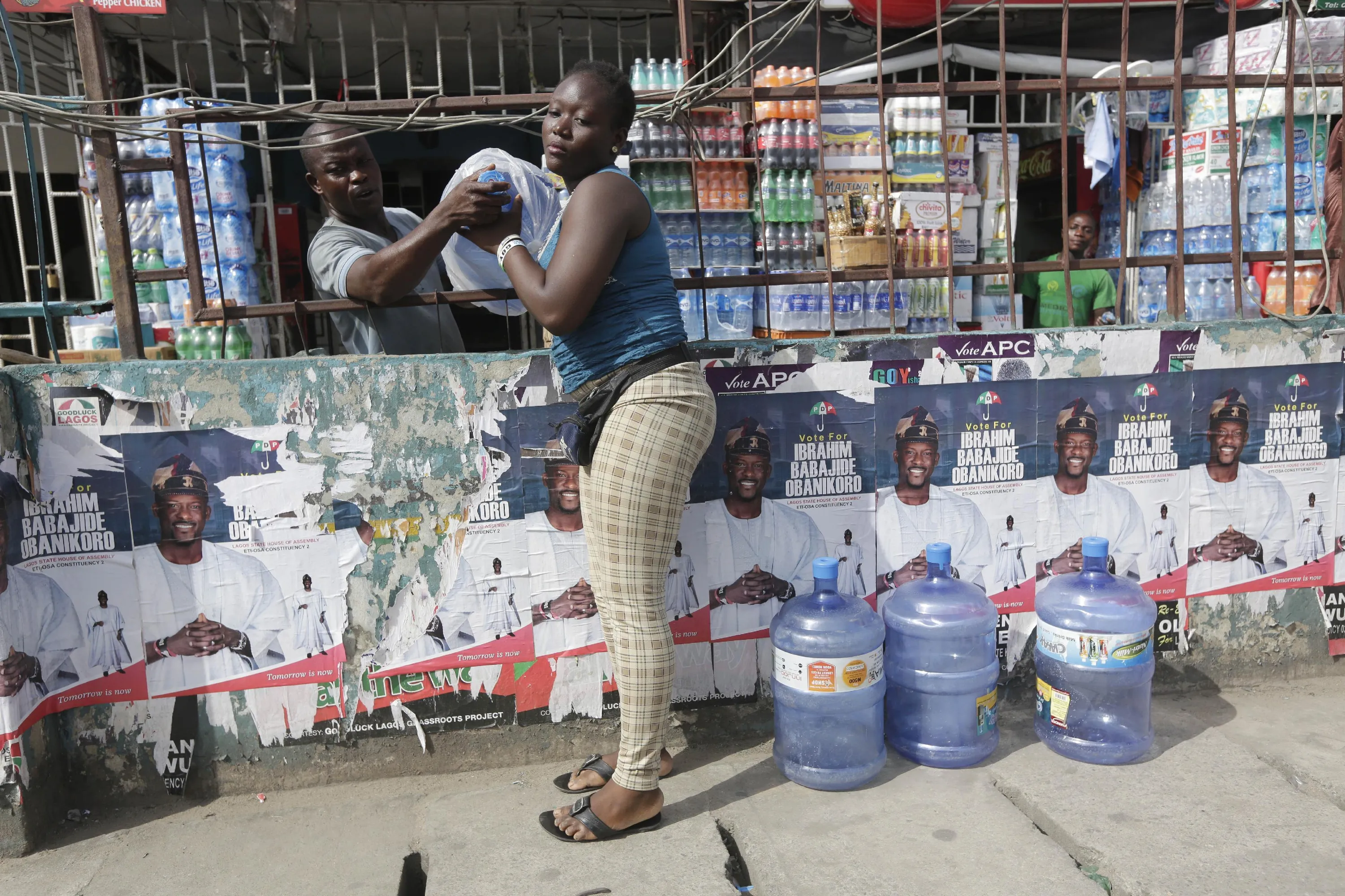 A vendor sells bottle water near election campaign posters on the street in Lagos, Nigeria, Friday, April 10, 2015. Nigeria goes to the polls Saturday to elect governors and state Assembly. (Photo by Sunday Alamba/AP Photo)