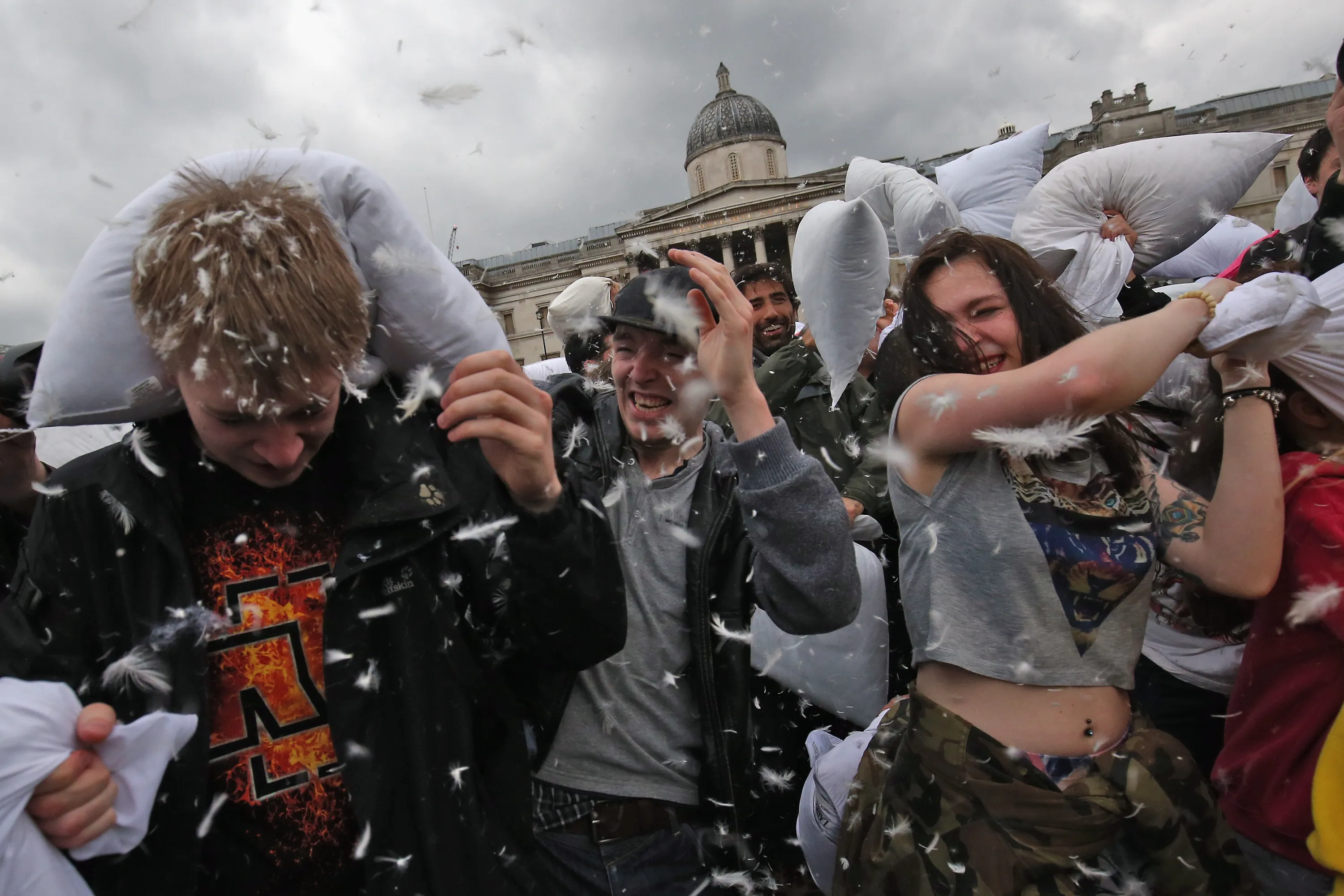Revellers take part in a giant pillow fight in Trafalgar Square on “International Pillow Fight Day” on April 4, 2015 in London, England. (Photo by Dan Kitwood/Getty Images)