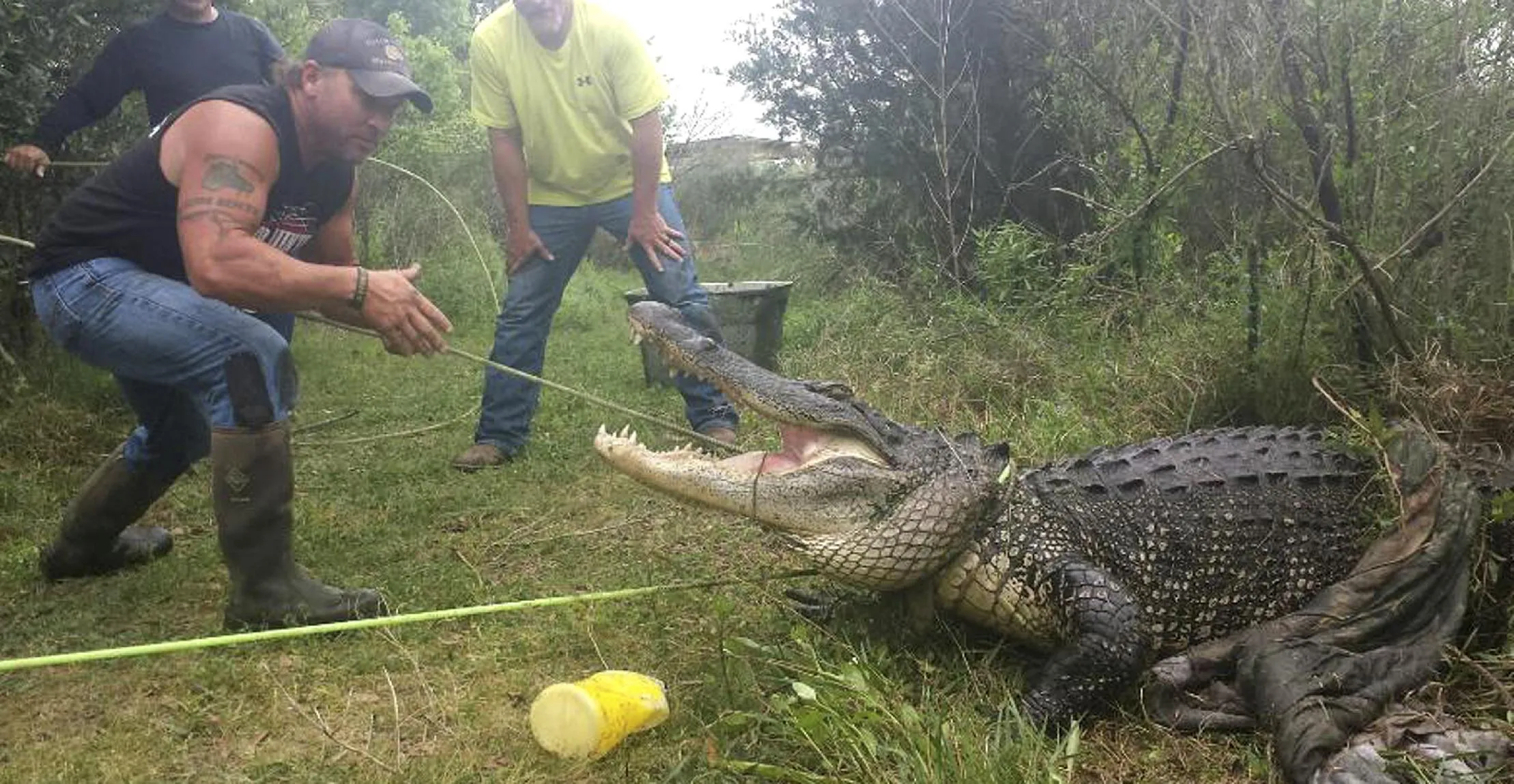 In this photo provided by Gary Saurage, Saurage stands near an alligator safely hauled out of a rural pond in Grove, Texas on Monday, April 6, 2015. Saurage said Tuesday, April 7, 2015, that the 11-foot reptile joins more than 400 other alligators at Saurage's Gater County preserve in Beaumont, Texas. (Photo by Jana Saurage/AP Photo)