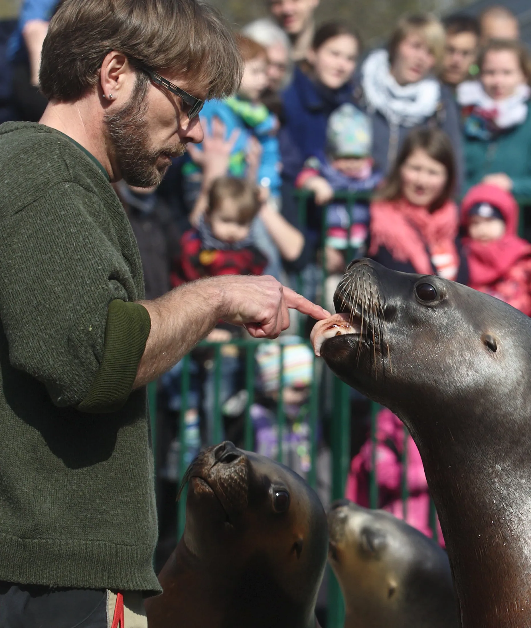 A zookeeper checks the mouth of a sealion during a feeding show at Schoenbrunn zoo in Vienna April 10, 2015. (Photo by Heinz-Peter Bader/Reuters)