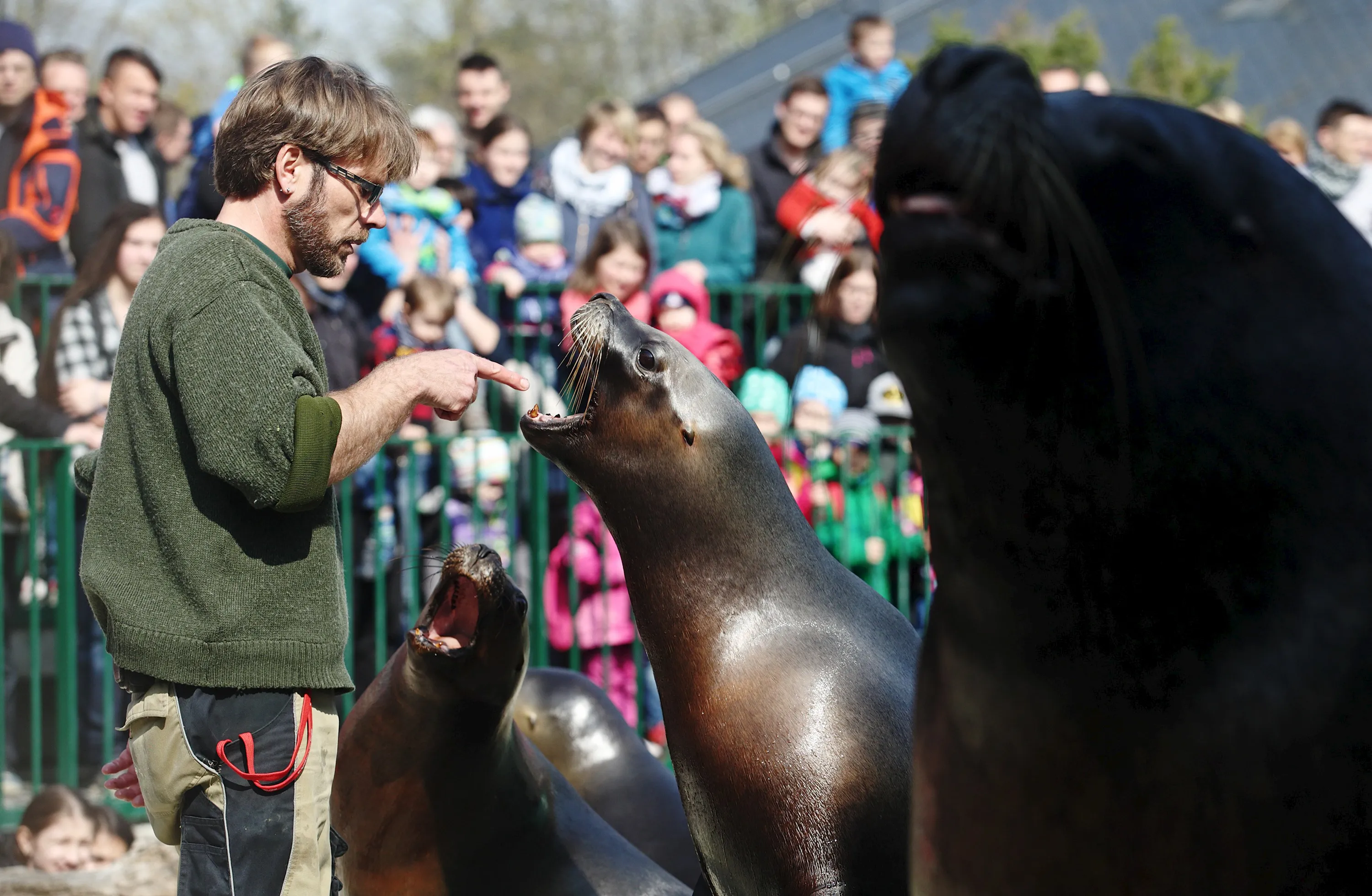 A zoo-keeper checks the mouth of a sea lion during the seal feeding show at Schoenbrunn zoo in Vienna April 10, 2015. (Photo by Heinz-Peter Bader/Reuters)