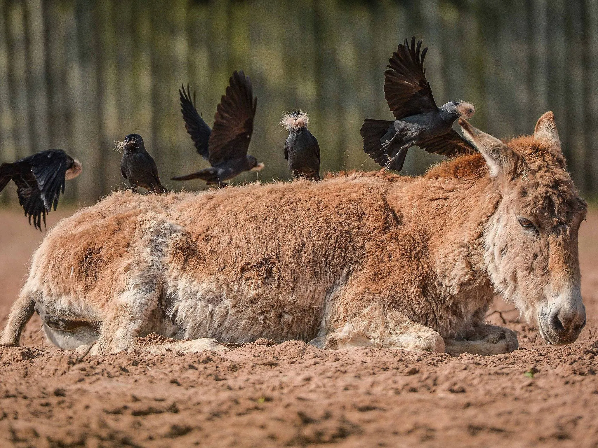 Sophie the onager, a rare species of wild ass, let a group of jackdaws pinch bits of her coat as temperatures touch 20 degrees at the Chester Zoo April 10, 2015. (Photo by Steve Rawlins/PA Wire/Chester Zoo)