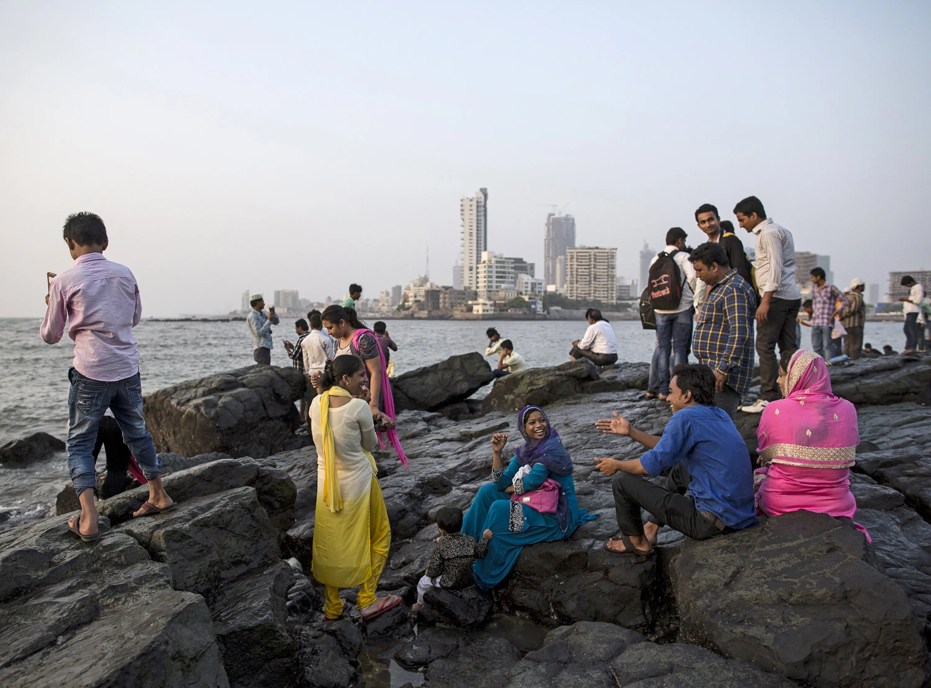 People sit on the rocks along the Arabian Sea next to Haji Ali Shrine in Mumbai April 9, 2015. (Photo by Danish Siddiqui/Reuters)