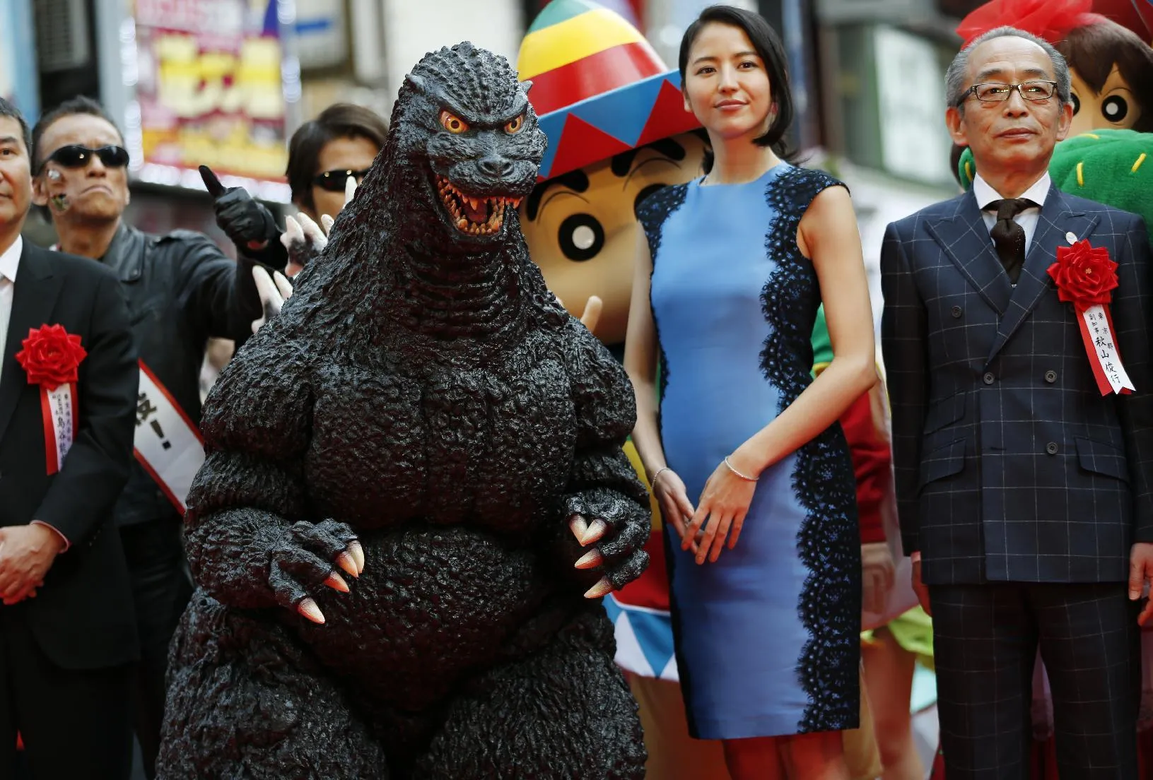 Godzilla and actress Masami Nagasawa, second right, attend a ceremony in downtown Tokyo for the opening of an entertainment complex run by its studio, Toho, where Godzilla head is on display, Thursday, April 16, 2015. The irradiated monster was appointed special resident and tourism ambassador for this Shinjuku ward, known for its down-home bars and noodle restaurants. Japan is hoping the biggest star in this nation's movie history will help lure tourists during a market-opening strategy launched by the prime minister. (Photo by Shuji Kajiyama/AP Photo)