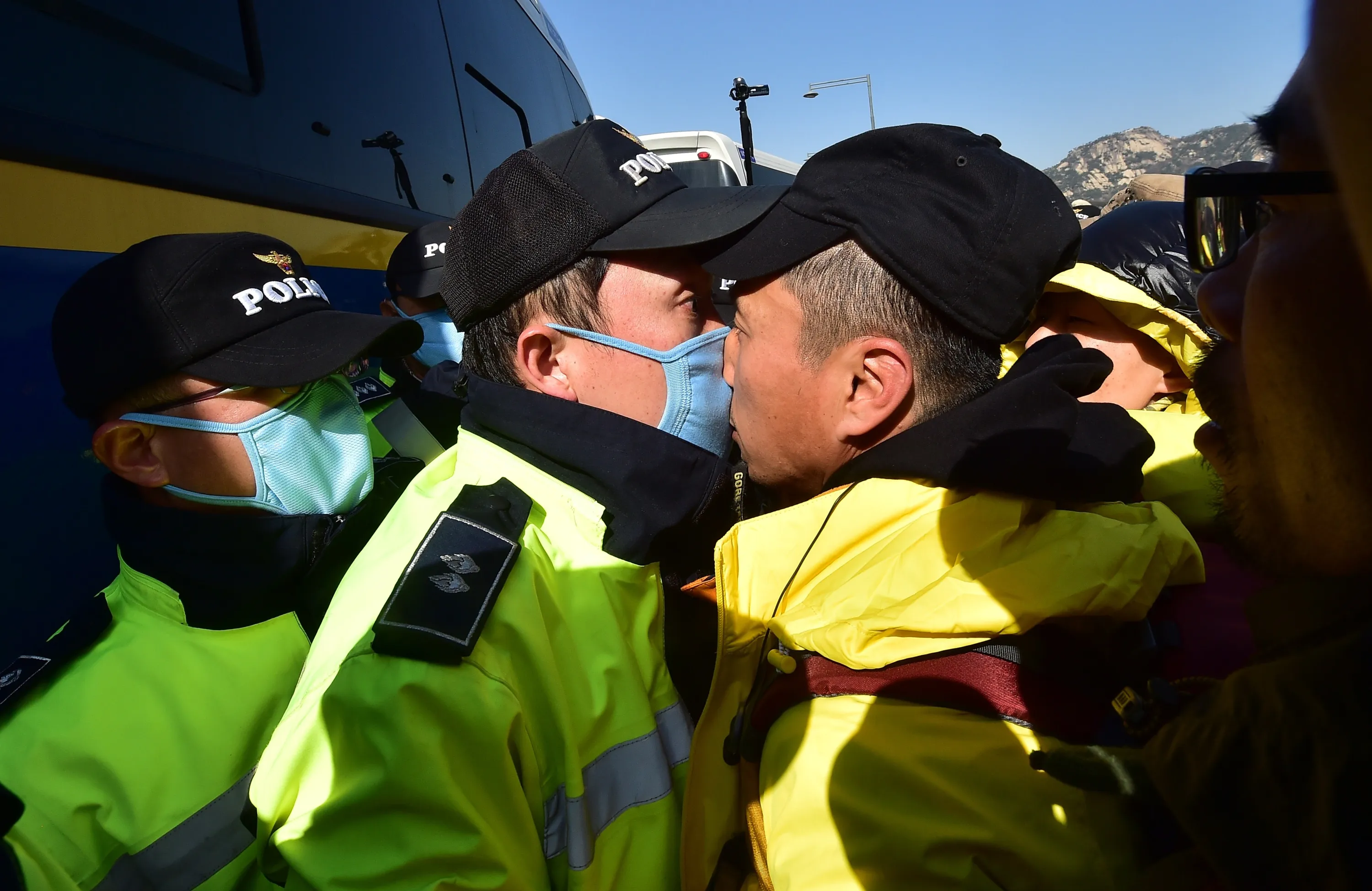 A relative (R) of the victims of South Korea's Sewol ferry disaster is in a nose-to-nose stand-off with a policeman (L) during an anti-government protest near the presidential residence in Seoul on April 17, 2015. Dozens of people continued their protests overnight after thousands of mourners rallied to mark the first anniversary of the disaster that claimed 304 lives. (Photo by Jung Yeon-Je/AFP Photo)